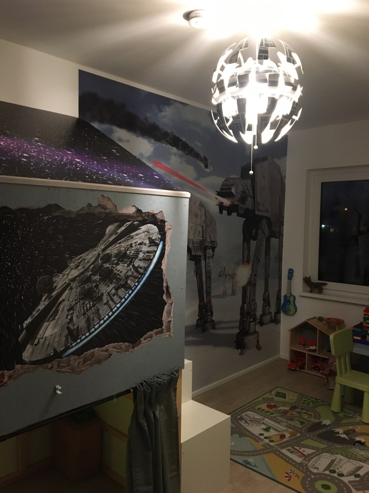 Und wichtig war bei der ganzen Aktion doch nur das Strahlen in den Augen unseres Sohnes, als er endlich in sein Star Wars Zimmer durfte. Habe ich schon erwähnt, dass ich eines der Weibchen bin, die ständig Star Wars und Star Trek verwechseln. Insofern habt Mitleid, wenn ich hier irgendwelche Verwechslungen fabriziere.