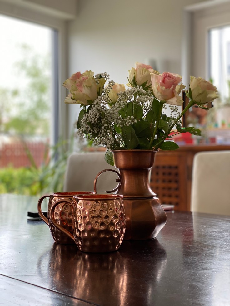 Ich hatte ja schon erwähnt, dass sich Swen meinem Hochzeits-Überraschungs-Perfektionismus angeschlossen hat und somit mindestens genauso viel Hirnschmalz in die Ideenfindung investiert. Er fand eine Kupfervase, die er sogar ersteigern musste. Auch sie ist nicht schön, aber offensichtlich selten. Und in Kombination mit Rosen und den beiden Kupferbechern mit dem Moskauer Esel gewann sie unheimlich an Schönheit.