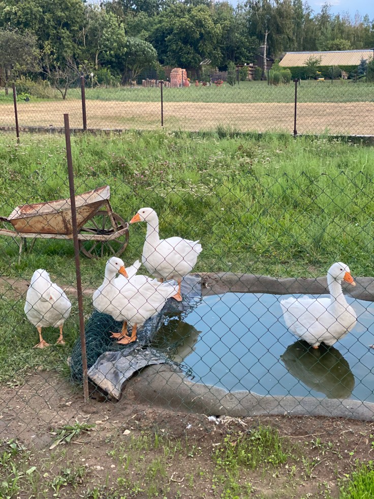 Was gibts denn sonst noch in unserem Naturpark? Jedes Jahr ein paar Gänse und Enten am Gartenzaun. Unser Nachbar zieht nämlich jedes Jahr ein bissl Federvieh auf, dass dann voll biologisch auf dem Weihnachtsteller landet. Und ehe jetzt geschimpft wird….wir finden das gut und lecker. Denn solange wir noch keine Vegetarier sind, was wir nicht sind, sind wir wenigstens so konsequent uns damit bewusst auseinander zu setzen. Also begleiten wir alle den kompletten Weg von: