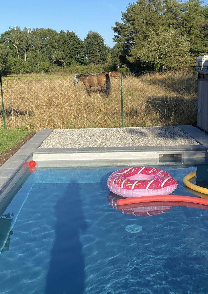 Wir haben hier aber auch noch größere Tiere zu bieten. Nachbars 5 Fotopferde, die zur Zeit besonders schön zur Geltung kommen, während wir im Wühlmaus-Pool chillen. Oder die ganzen Katzen, die ich mittlerweile nicht mehr zählen oder auseinanderhalten kann. Auch den Marder, die Waschbären und den Dachs begrüßen wir hier regelmässig.