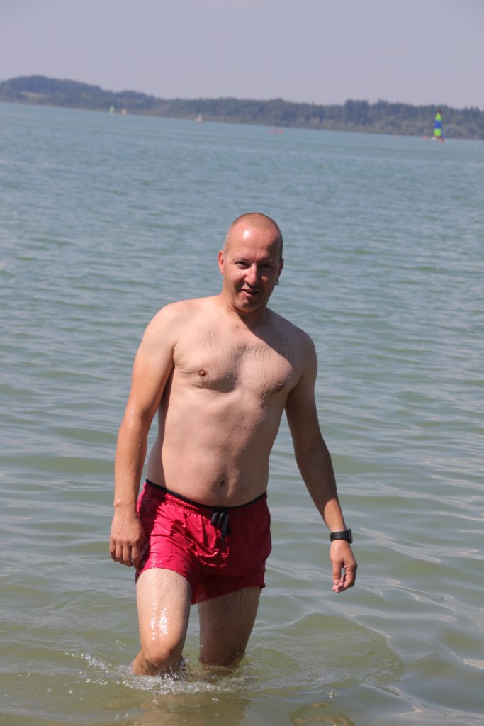 Und die nächste Frage umfasste die Suche, nach einem Baum für mein Bedürfnis. Es war ja ein Blumenfeld, also gerade nicht soviele Bäume in der Nähe. Aber in ca. 500 Meter Entfernung waren Büsche und Bäume und ich rannte förmlich hin und suchte nach einer mit alten Taschentüchern gesäumten Niesche. Kaum gefunden, hing mir die Hose schon in Kniehöhe, so eilig hatte ich es. Das Problem: Hinter mir standen insgesamt 5 Bienenstöcke und ich sah mich förmlich mit runtergelassenen Hosen quer durch die Sonnenblumen und Gladiolen flüchten. Aber es ging alles gut, ich war erleichtert und wir schafften die letzten Kilometer an den „Chemiesee“ (kleiner Joke aus dem Bayern 3 Radio).