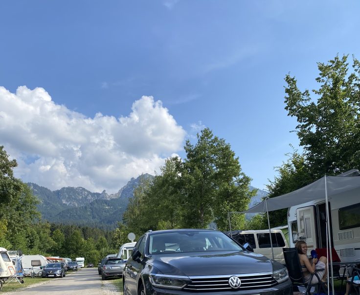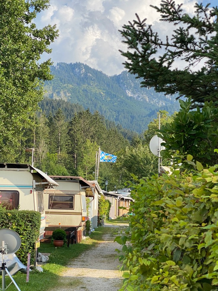 Heute fuhren wir hauptsächlich über Lande und haben verstanden, warum uns der ADAC-Routenplaner mit Wohnanhänger-Option eine andere Route als Google Maps vorschlug. Wurde halt gelegentlich ganz schön eng in den Maps-Kurven und fehlende Wendemöglichkeiten sind auch nicht zu empfehlen. Aber wir haben es an den Bannwaldsee bei Schwangau geschafft. Und es war eine lustige Fahrt, denn es gab das allseits beliebte Spiel “ Ich sehe was, was Du nicht siehst und das ist…“. Georg’s Spielweise ist immer besonders speziell, denn der nennt uns eine Farbe und wir raten wie die blöden und irgendwann entscheidet er im nachhinein, was es denn gewesen sein könnte. Wir sind dann meist schon Kilometer weiter und sehen gar nicht mehr, was er damals gesehen haben will. Aber ich schätze, das liegt an seinem Röntgenblick oder Weitblick. Wir sind da viel zu eingefahren mit unseren Betrachtungsweisen.