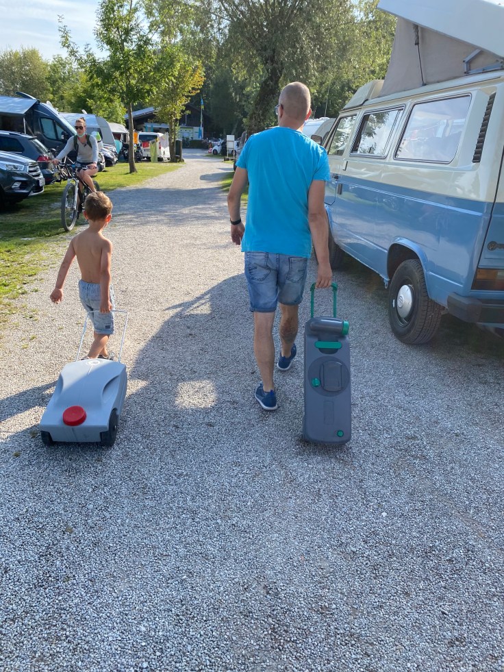 Heute war mal wieder Fahrtag oder wie Georg sagen würde: Wir fahren in den nächsten Urlaub. Ja wir machen diesen Sommer insgesamt sieben Mal Urlaub und heute war das dritte Mal Urlaub angesagt. Ich liebe seine äußerst positive Einstellung. Ähnlich wie er uns den Geldverlust beim Kauf von Eis erklärt. Denn ganz begeistert rennt er dann und ruft: „Papa, Papa, schau mal du hast sogar für das Eis noch Geld für Dich bekommen.“. Die Tatsache, dass er das Eis bezahlt hat und es sich nur um Rückgeld handelt, wird komplett ignoriert. Auch hat er nun beschlossen, dass er immer das Rückgeld behalten will, damit er nun endlich auch mal Geld hat. Seit dieser Einstellung rechne ich mit einem sorgenfreien Leben wenn ich hochbetagt bin, denn mein Sohn wird so sicherlich stinkenreich werden.