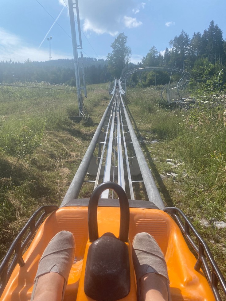 An dieser Stelle sei gleich noch ein kleiner Tipp erlaubt: fahrt nie mit einem kurzen Kleidchen Sommerrodlbahn, denn es bleibt nicht, wo es bleiben soll und in der letzten Kurve wird bekanntlich ein Foto gemacht. Ich glaube, ich muss nicht mehr erzählen. Habe dann unten wegen den Jugendschutzverordnungen dafür plädiert, dass das Foto umgehend und endgültig gelöscht wird. Bei Basic Instinkt sah das irgendwie erotisch aus, beim Sommerrodeln eher so wie ein Katastrophenfilm.