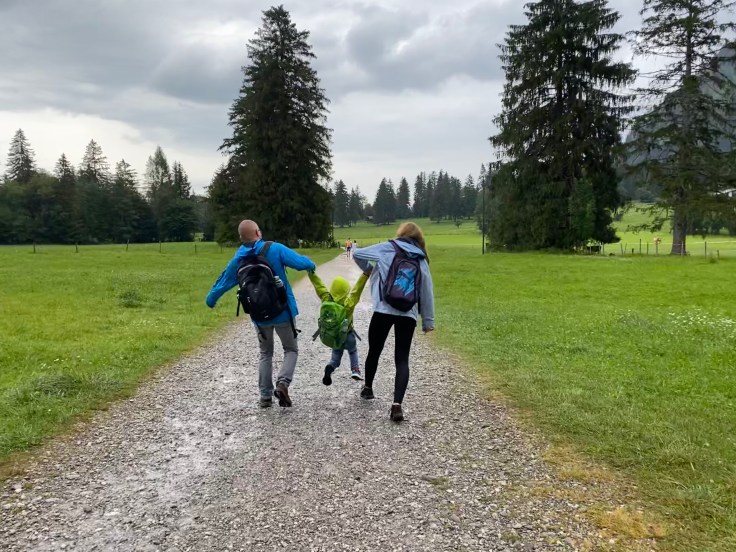 Aber jetzt ging es zurück auf einer anderen Route nach Schwangau mit dem Ziel des zweiten Schlosses und des Alpsee. Doch nach einem leckeren Essen kam der angekündigte Regen und wir traten den Heimweg im Sommerregen an. Schlechtes Schuhwerk beschert einen nasse Füße und einen trockenen Kopf. Aber darüber beschwere ich mich nicht, denn das wussten wir vorher. Und wenn man schon nass ist, kann man auch viel besser durch die Pfützen laufen, singen, springen und pullern.