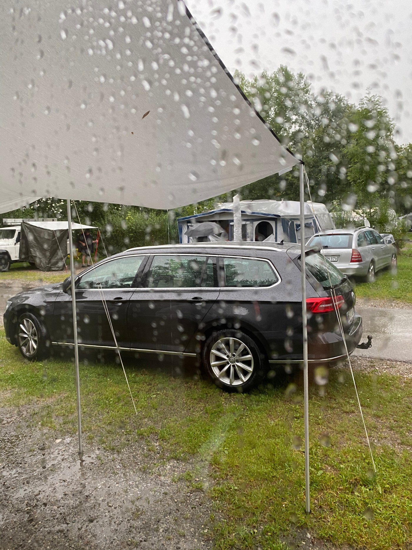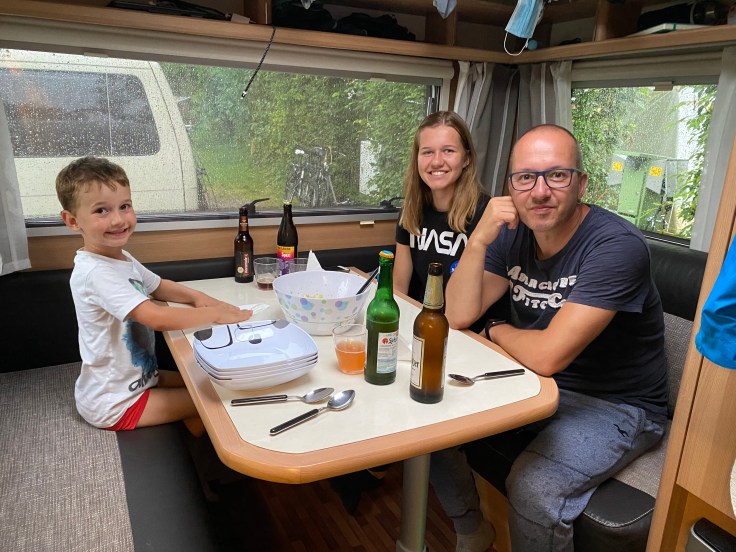 Und außerdem hatten wir nach fünf kochend heißen Tagen auch ein Ziel: ab auf unsere Wohnwagenspielwiese, kuscheln und Anna und Elsa schauen bei Chips und Schokolade. Der erste gemütliche Abend im Wohnwagen steht an und wir haben sogar gezaubert und aus dem Bett einen Tisch gemacht. David Copperfield würde vor Verblüffung seinen Job an den Nagel hängen, während die Dauercamper nur müde lächeln. Aber wir mit unserem gedeckten Tisch, inklusive blütenweißen Taschentuch-Servietten sind mächtig stolz und genießen unser Tiny House bevor es morgen in den vierten Urlaub geht.