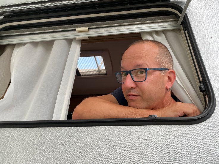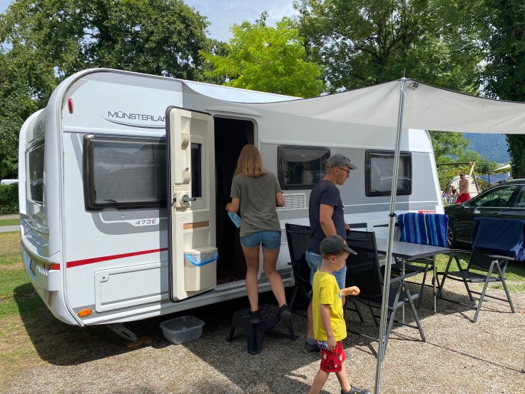 Aber dann haben wir uns doch noch einmal von einem informativen Dauercamper aus der Ruhe bringen lassen. Wir haben nämlich nach den ersten 50 Kilometern unseres Trips und zahlreichen missglückten Versuchen mit unseren Verlängerungs-Rückspiegeln für uns beschlossen, dass man diese ja eh nur zum Überholen braucht und sie deshalb einfach weggelassen. Überholen in Linkskurven stellte sich dabei als DIE Lösung heraus und so mussten wir immer nur solange warten bis uns eine Linkskurve ereilte. Aber der liebe Dauercamper von Nebenan wies uns freundlich darauf hin, dass die Dinger doch Pflicht sind, wenn man die hinteren Ecken seines Wohnwagens nicht sehen kann. Ich hätte ja mit den Polizisten diskutiert, dass wenn ich mich nur weit genug rauslehne und Swen mich an dem linken Fuß festhält wir sehrwohl die hintere Kante irgendwie sehen können, aber Swen wollte lieber sicher gehen und mir nicht die Diskussionsführung überlassen. Auch die Erklärung mit den Linkskurven hätte uns wohl in der Diskussion nicht so viel weitergebracht. Also fummelten wir wieder gefühlt zwei Stunden an den Verlängerungs-Rückspiegeln rum, bis sie endlich mehr schlecht als recht positioniert waren. Und was passierte? Keiner hat uns kontrolliert!