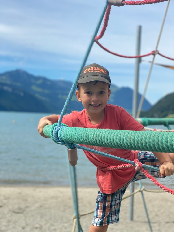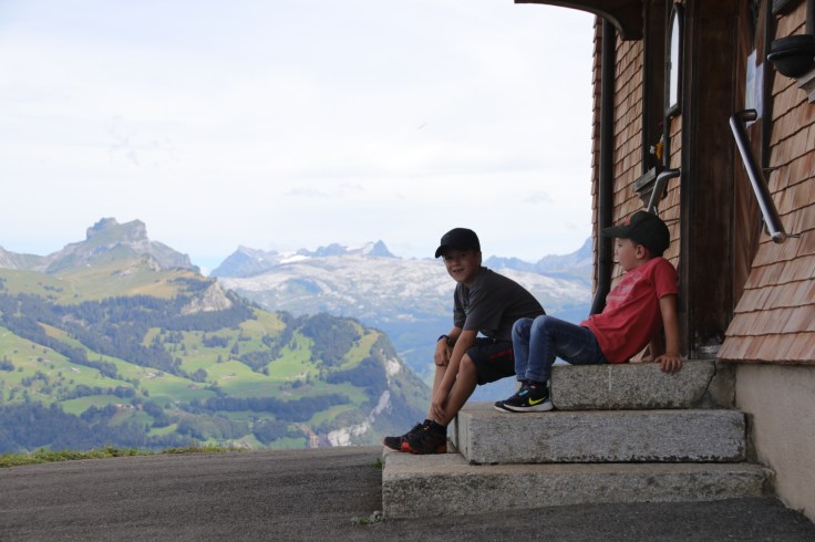 Ganz oben auf dem Fronalpstock ist übrigens ein Spielplatz, soweit so gut. Aber es gibt halt auch Wespen. Und eine Kombination von rumtollenden Kindern mit Wespen geht meist nie gut aus. Dieses Mal traf es Georg, der augenblicklich aufschrie, sodass wir auch gleich 1+1 zusammenzählten und versuchten seine Panikattacke nicht mit unserer zu verstärken. Also sackte ich mir Georg und rannte völlig ruhig in die Almküche. Hatte ja schließlich ein Vermögen bezahlt, da wäre doch ne halbe Zwiebel gratis noch drin. Gab es dann gleich auch inklusive des Angebotes von juckreizstillenden Salben. Nett sind se, die Schweizer.