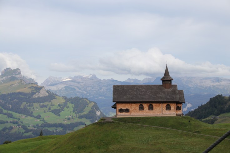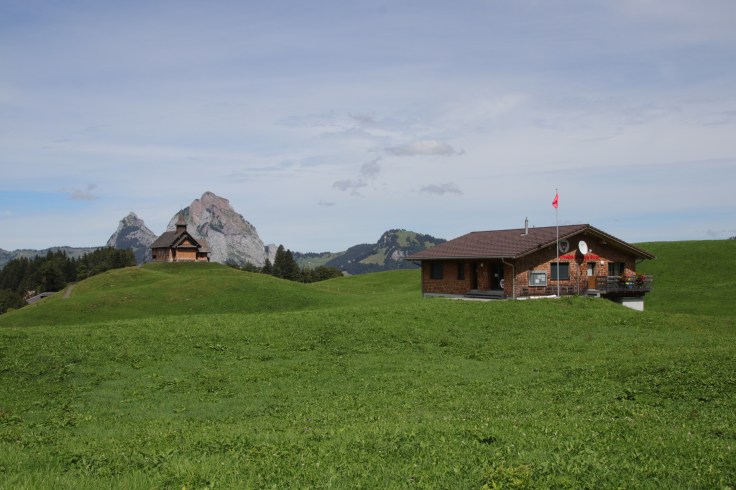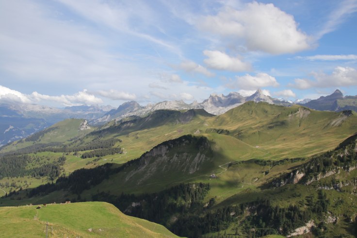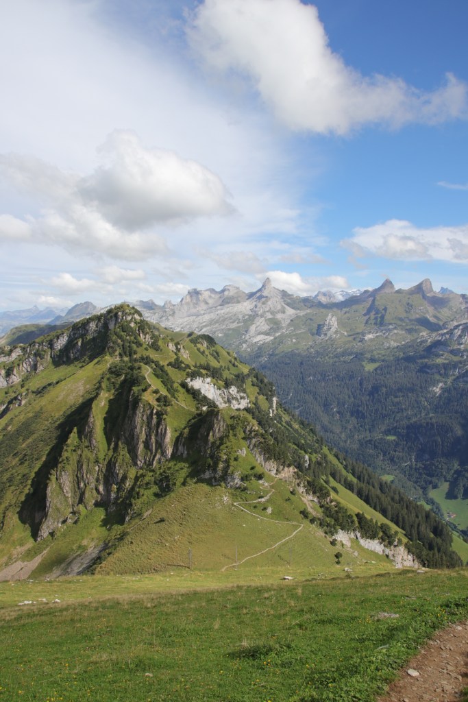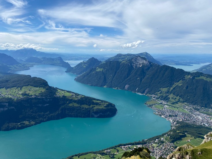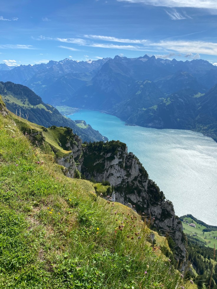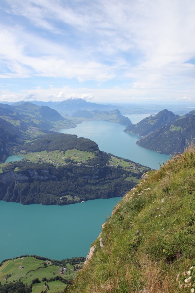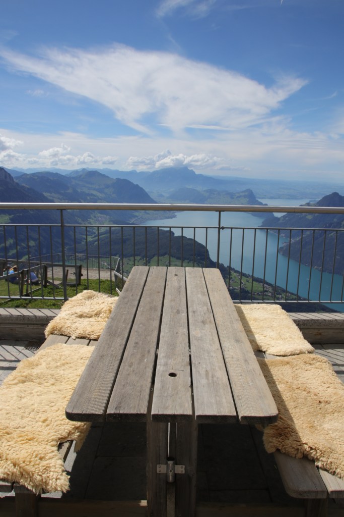 Von Stoos ging es dann auf einem kurzen Wanderweg zu den Sesselliften um den Fronalpstock zu erreichen. Und dort oben empfing uns ein Wahnsinnsausblick über den Vierwaldstätter. Wir hatten eine so unglaubliche Sicht in alle Richtungen, die uns kurzzeitig umzugswillig machte. Denn unser Cossi ohne Berge kann gegen diesen Ausblick nicht mithalten. Dann dachten wir kurzzeitig an die Preise für die Seilbahnen und der Umzugswunsch hatte sich spontan in einen Wir-kommen-mal-wieder-Wunsch verändert, wenn wir gespart haben. Dies blieb auch so, als wir die Rechnung für den Mittagssnack bekamen. Aber dann schaute ich wieder in die Berge und alles war schön. Das kann auch nicht das Dauergebimmel der Kuhglocken ändern.