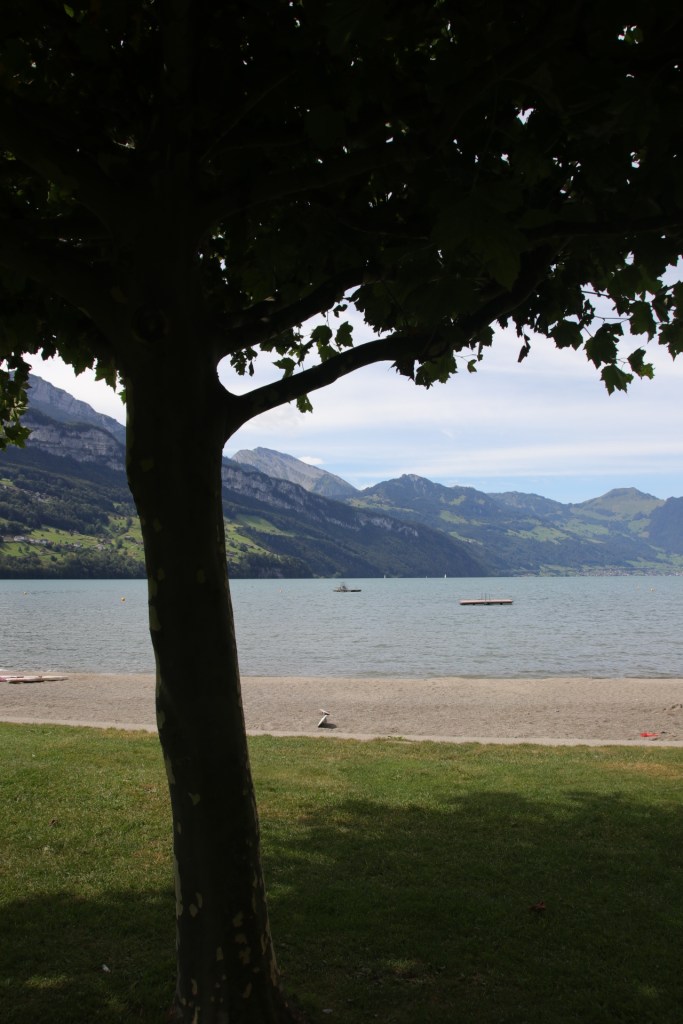 Und auch im fünften Urlaub, am vierten See stand eines auf unserem Pflichtprogramm, nämlich baden gehen. Okay, etwas kühler war es hier schon, dafür konnte man endlich mal ohne Wasserschuhe ins Wasser laufen. Während ich ja so eher der Typ bin, der bei unter 30 Grad Wasser Temperatur pro fehlendem Grad zehn Minuten Gewöhnungszeit benötigt um ins Wasser zu kommen, ist Georg eher so der Typ „Zack rein“. Gott-sei-Dank kann das Kind nun schwimmen, sonst müsste ich immer sofort ohne Gewöhnungszeit hinterher hechten. So auch heute: Georg ging ohne vorherigen Wasserkontakt zur Rutsche und rutschte direkt rein ins kühle Nass. Ich hätte heute locker 100 Minuten gebraucht und hatte doch nur 5 Minuten bevor Georg zu weit raus schwamm. Mitten im See gab es nämlich eine Platform und da wollte Georg hin. Pini musste mit und absolvierte somit ihre eigenen Challenge, dunkler See ohne Grund. Mit beiden habe ich es zur Plattform geschafft und wenn ich sie gefragt hätte, hätten sie rückzu lieber ein Boot genommen. Es gab aber keins. Also wieder ins dunkle Nass und an die Küste zittern.
