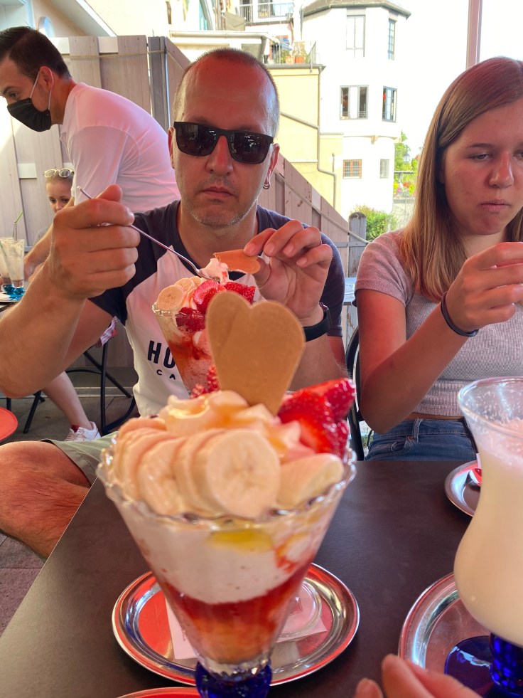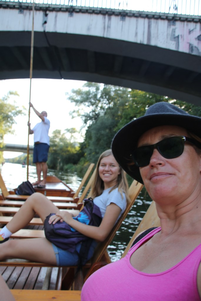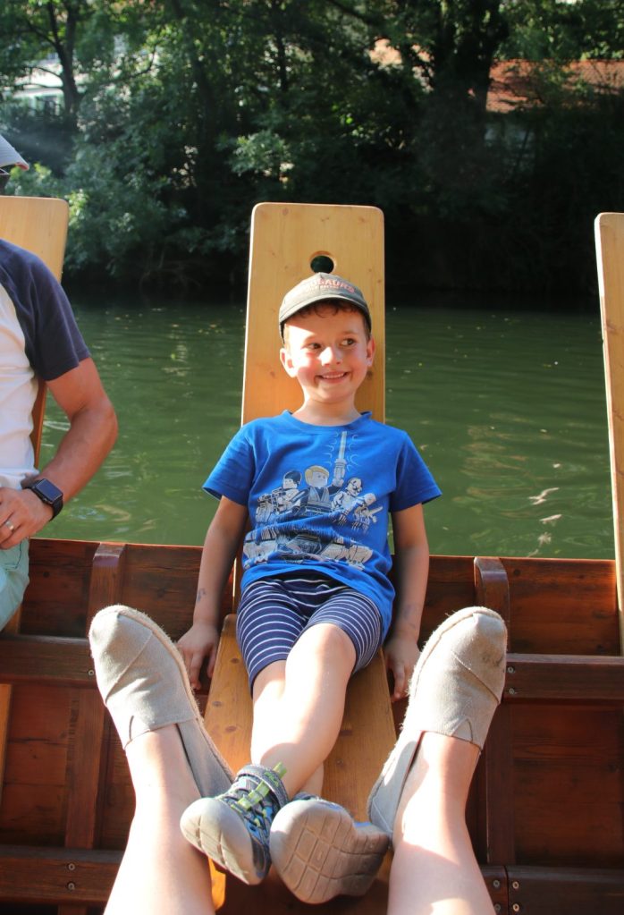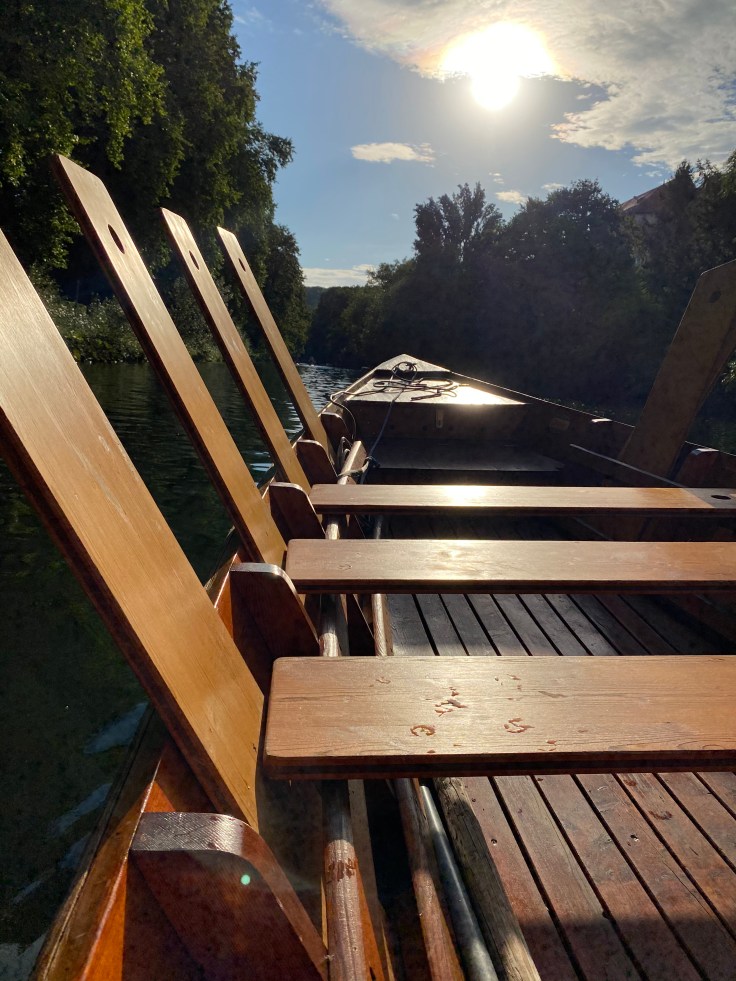 Nachdem wir uns mit unseren letzten Kräften in ein Eiskaffee mit Terrasse zum Neckar gekämpft hatten, stärkten wir uns mit reichlich Zucker und Kalorien um der Hitze etwas entgegensetzen zu können. Der Zucker putschte uns auf und dann waren auch wir bereit auf den Kahn zu gehen und wir ließen uns staken. Die Sonne ließ langsam an Intensität nach und das Wasser strahlte von unten kühl ab. Ich persönlich hätte ja am liebsten die Füße rausgehangen. Aber entweder hätte ich mit der Aktion das Boot zum Kentern gebracht, oder ein Fisch hätte sich in meinem dicken Zeh verbissen, was schlussendlich das Boot trotzdem zum kentern gebracht hätte. Also mit diesen Perspektiven blieb ich einfach ruhig sitzen und genoss. Reicht ja schon, wenn Georg ständig die Positionen wechselte.