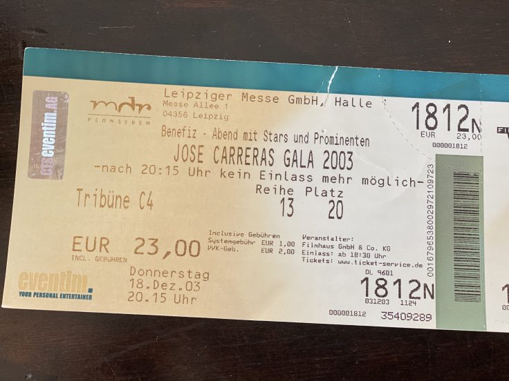 Meine älteste körperlich anwesende Karte ist für andere vielleicht peinliches Beweismaterial, aber für mich auch eine besonders schöne Erinnerung. Denn es war der 18. Dezember 2003 und die Jose Carreras Gala in Leipzig. Und ich schäme mich keinen Deut dafür. Erstens weil ich mit meiner geliebten Oma dort war und es ihr erstes und wohl auch letztes Konzert dieser Art war und Zweitens weil ich Pavarotti habe das „Ave Maria“ singen hören und damals einfach nur tief berührt war, ob dieser Stimme. Auch unvergessen war unsere Fahrt zum roten Teppich, denn meine Mutter hatte unseren Fuhrservice übernommen und meine damals noch rüstige Omi als fußlahmes Exemplar dargestellt und sich so bis vor den Haupteingang mit roten Teppich vorgekämpft um uns abzusetzen. Ich schätze, noch heute überlegen einige Journalisten, wer die beiden „Schwestern“ wohl waren und wir Mädels hatten wenigstens einmal einen wirklich standesgemäßen Auftritt mit Blitzlichtgewitter.