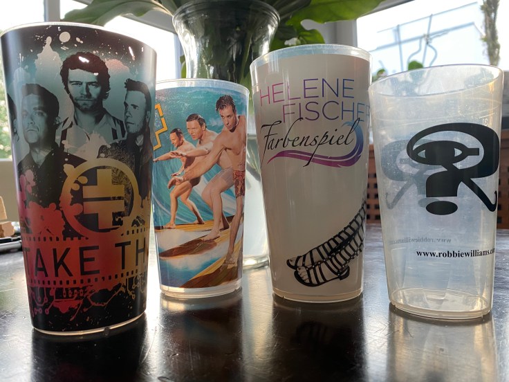 Dann ist es jedenfalls irgendwann soweit, das Konzert ist nur noch wenige Stunden entfernt und ich packe ritualmässig meine Tasche. Dieses hässliche, zerschlissene Ding war schon überall dabei und ist wirklich nicht schön. Aber darum geht es ja nicht. Sie muss praktisch sein, die richtige Größe für die Tickets haben und es müssen noch so wichtige Sachen wie Handy, Schlüssel, Ausweis, Geld, Tampons, Regencape und Taschentücher rein. Auch kann meine Tasche Unglaubliches, denn die Trinkbecher passen genau in die Außentasche und so habe ich die Hände frei zum Klatschen. Ich hatte ja schon erwähnt, dass die Konzertbecher einen festen Platz in meinem Küchenschrank haben, wo Robbie Williams in Helene Fischer steckt und Rammstein auf Take That trifft. Hier ist noch so viel Platz für mehr und Helene & Co. brauchen mal wieder etwas Abwechslung.