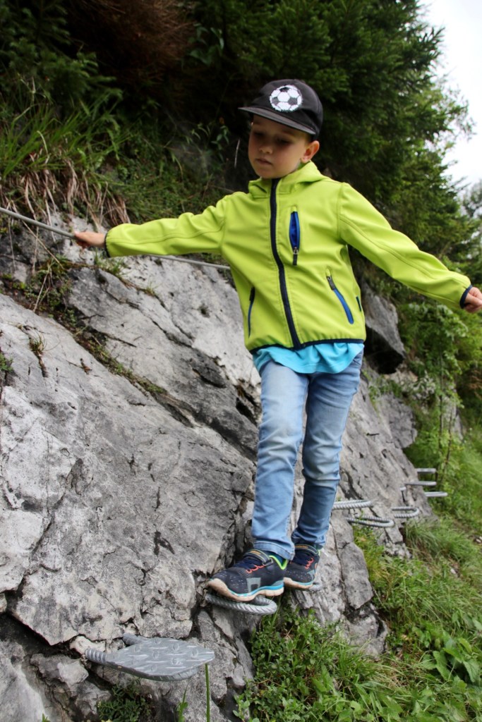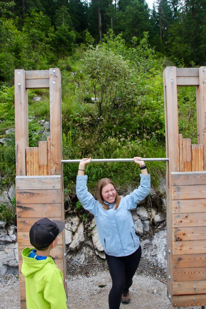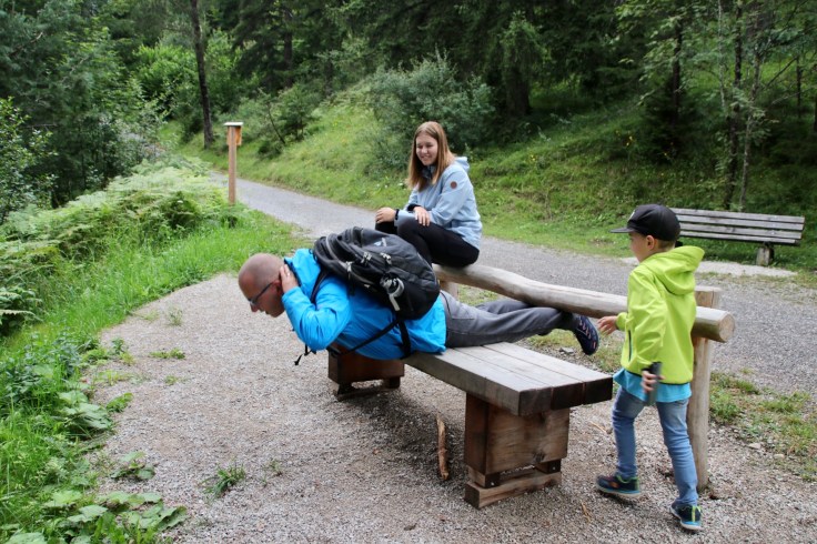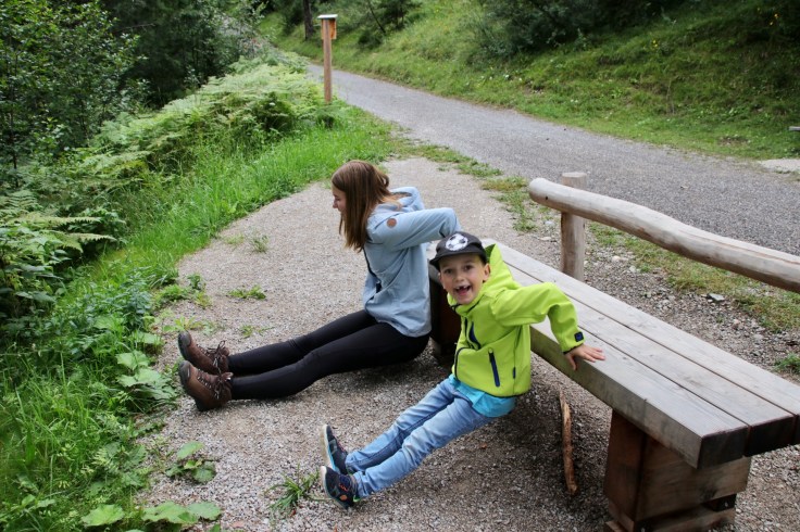 Heute wollten wir aber endlich mal wandern und die neuen Wanderschuhe einlaufen, die eingepackte Regenjacke einmalig nutzen und den dicken Pulli zumindest einmal vollschwitzen. Also ab auf den Panoramawanderweg nach Lermoos bei herbstlichen Temperaturen. Und hier konnten sich meine drei Kinder so richtig auspowern. Aller hundert Meter befanden sich Freiluft-Sportgeräte aller Art. Als ob es nicht reichen würde, dass ich als Flachlandtirolerin nun hier in den Bergen bergauf hecheln muss. Ich bewege mich hier so ungefähr einen Kilometer höher, als ich es sonst tu und dies kommt bei mir einem Höhentraining gleich. Also für mein Verständnis schon reichlich genug Freiluftsport. Meine drei Kinder, also die beiden echten und das große Kind hatten aber furchtbar viel Freude zu hangeln, zu balancieren und zu pumpen. Und ich hatte Gott-sei-dank eine perfekte Ausrede, meinen Fotoapparat. Hätte ich den nicht, hätte ich womöglich mitmachen müssen. Welch abwegige Vorstellung. Und außerdem gäbe es dann nicht diese wunderbaren Bilder.