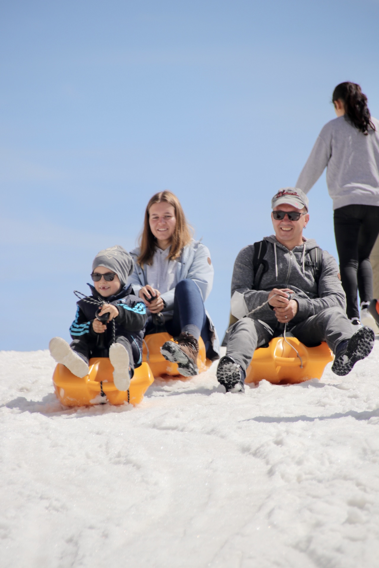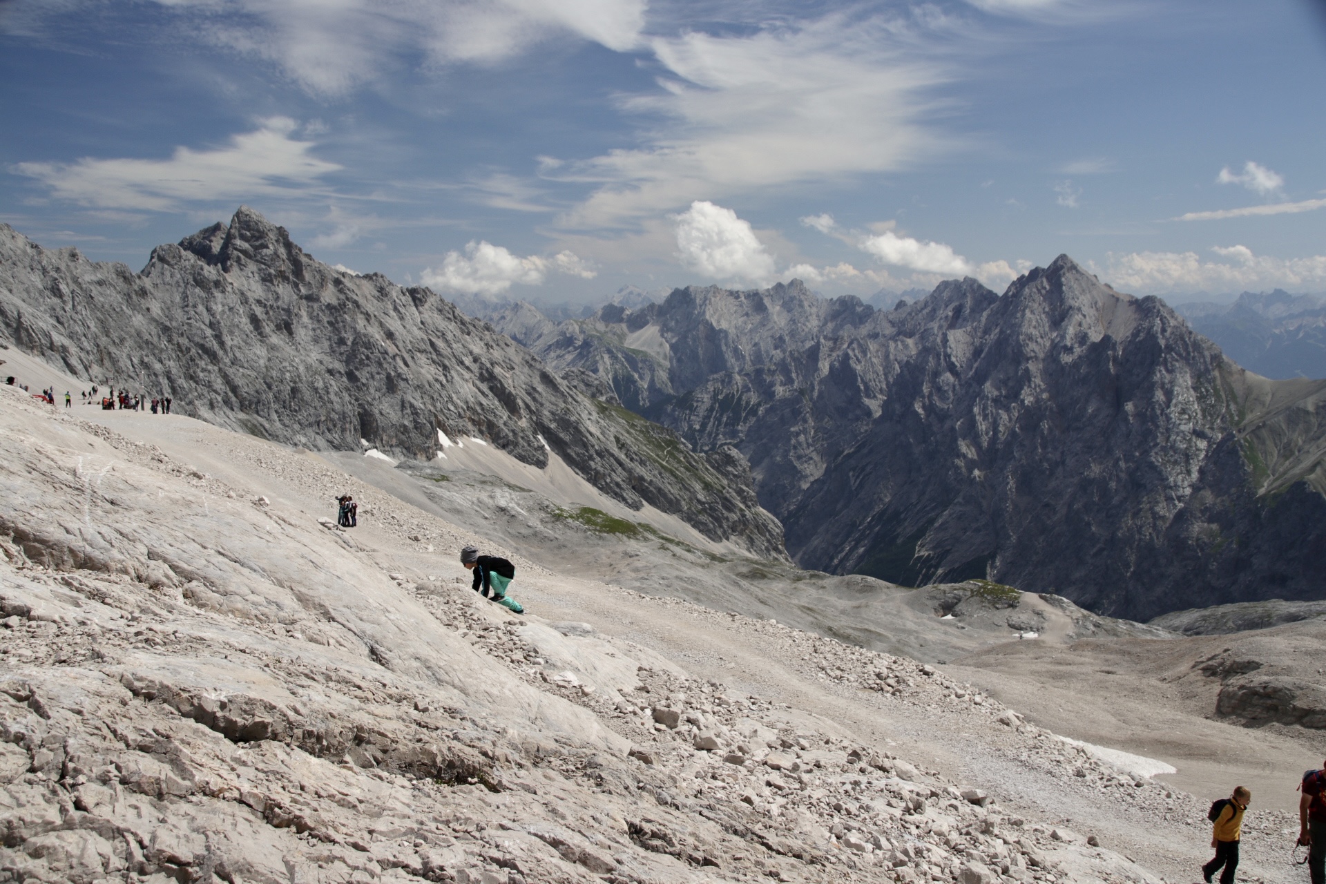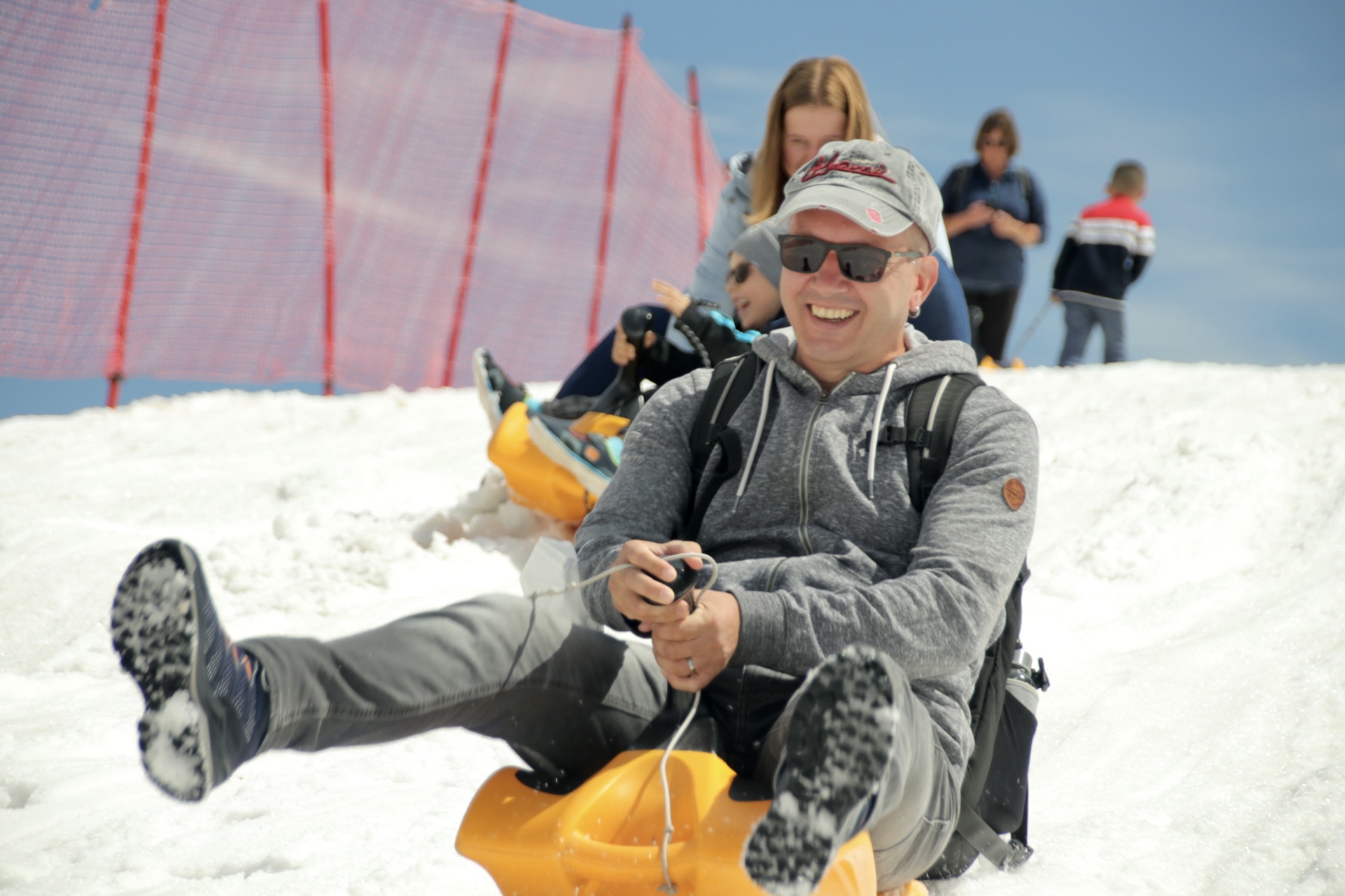Ihn Gletscher zu nennen ist quasi schon eine Halbwahrheit in sich, denn inzwischen ist es nur noch ein Gletscherchen und man ist weit entfernt von einem Wintererlebnis im Sommer. Es sei denn man heißt Georg und ist erst 6 Jahre. Dann nämlich zählt jeder Schneeball als Winter und wenn man auch noch Rodeln darf, sind es quasi Winterferien. So auch heute, denn es flogen Schneebälle und es wurde gerodelt bis die Buxe nass war. Was die Buxe betrifft, so betraf es nur uns Erwachsene. Denn für unser Kind hatten wir vorbildlicherweise eine Matschhose mit. Warum gibt es eigentlich keine Matschhosen für Erwachsene. Hätten wir heute gebraucht. Denn bei der rasanten Abfahrt schob sich immer etwas nasser Schneematsch zwischen den Beinen gen Körpermitte und wir Nichtmatschhosentragenden sahen dann alle aus, als hätten wir es nicht mehr zur Toilette geschafft. Läuft sich auch so blöd. Einerseits immer breitbeinig, damit es dazwischen trocknen kann und andererseits schnell, weil der Trocknungswind auf der Zugspitze recht kühl ist. Die nächste Blasenentzündung lässt grüßen. Also ich möchte gerne eine schöne pinke Matschhose mit Einhörnern oder Elfen, bin da total flexibel.