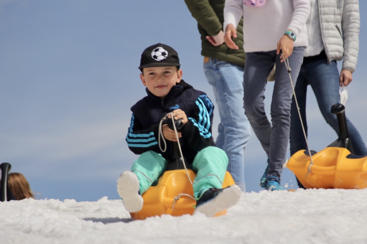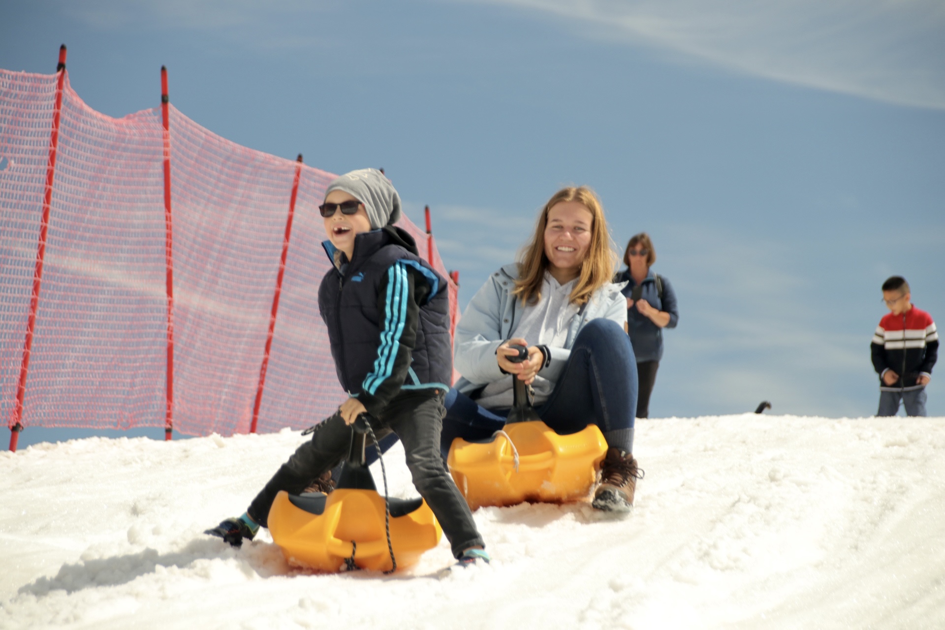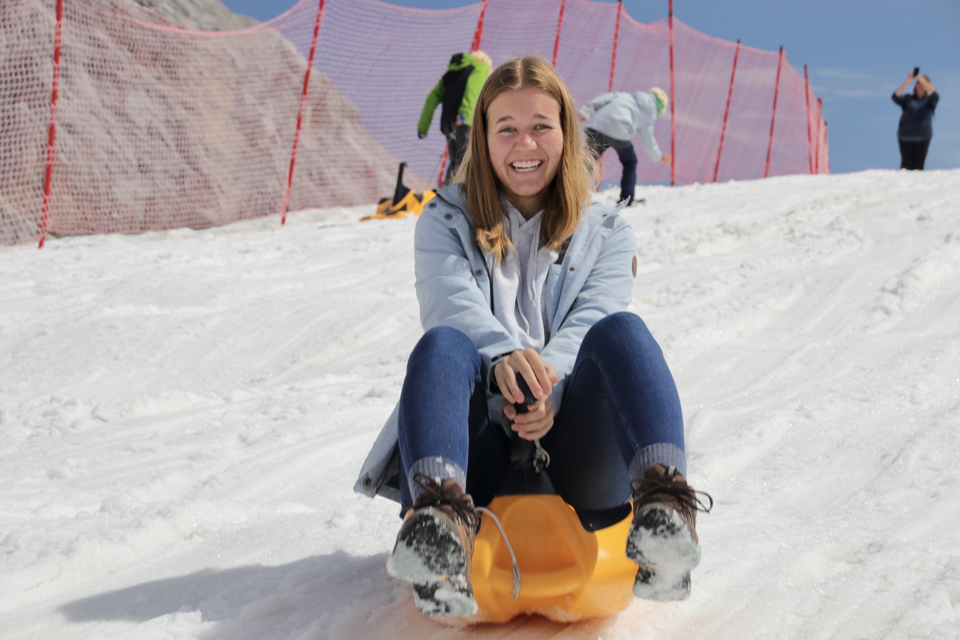 Ihn Gletscher zu nennen ist quasi schon eine Halbwahrheit in sich, denn inzwischen ist es nur noch ein Gletscherchen und man ist weit entfernt von einem Wintererlebnis im Sommer. Es sei denn man heißt Georg und ist erst 6 Jahre. Dann nämlich zählt jeder Schneeball als Winter und wenn man auch noch Rodeln darf, sind es quasi Winterferien. So auch heute, denn es flogen Schneebälle und es wurde gerodelt bis die Buxe nass war. Was die Buxe betrifft, so betraf es nur uns Erwachsene. Denn für unser Kind hatten wir vorbildlicherweise eine Matschhose mit. Warum gibt es eigentlich keine Matschhosen für Erwachsene. Hätten wir heute gebraucht. Denn bei der rasanten Abfahrt schob sich immer etwas nasser Schneematsch zwischen den Beinen gen Körpermitte und wir Nichtmatschhosentragenden sahen dann alle aus, als hätten wir es nicht mehr zur Toilette geschafft. Läuft sich auch so blöd. Einerseits immer breitbeinig, damit es dazwischen trocknen kann und andererseits schnell, weil der Trocknungswind auf der Zugspitze recht kühl ist. Die nächste Blasenentzündung lässt grüßen. Also ich möchte gerne eine schöne pinke Matschhose mit Einhörnern oder Elfen, bin da total flexibel.
