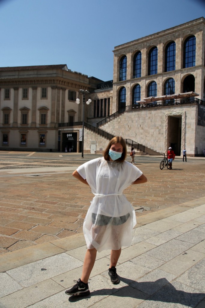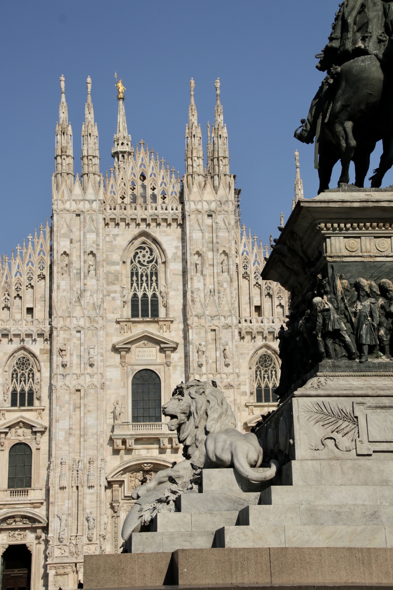 Begonnen wurde dann unser Sightseeing natürlich am Dom und gleich dort fielen wir durch das Raster. Also Pini flog durch das Raster, denn ihre weiblichen Beine entsprachen nicht den Vorgaben der göttlichen Bedeckung. Wäre sie erst Zwölf gewesen, hätte man die gleichen Beine durchgehen lassen. Aber mit 17 ging das gar nicht. Nun hatten wir die Wahl, uns an einer hundert Meter langen Schlange in der Sonne anzustellen, um einen Überhang für diese schändlichen Beine zu besorgen, oder wir wählen den typischen Daniela-Weg. Also hechtete ich zum Ausgang des Doms und wartete auf die erste Dame mit dem selbigen Schicksal. Ob es nun an den Beinen oder nicht bedeckten Schultern lag, war mir dabei völlig schnuppe. Und bevor dieser Umhang in hohem Bogen in den nächstgelegenen Mülleimer flog, schnappte ich ihn mir und kleidete Pini an. Irgendwie hatte ich mir die Mailänder Mode anders vorgestellt. Musste wohl einem sehr exzentrischen Modeguru eingefallen sein, dieser Überwurf zum Binden. Wenigstens etwas Farbe, statt diesem unschuldigen Weiß hätte er verdient. Aber mit unserer Doppelnutzung war es wenigstens eine nachhaltige Mode.