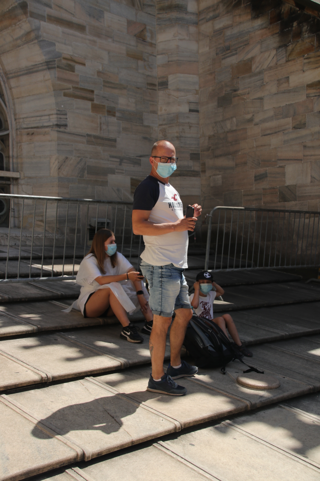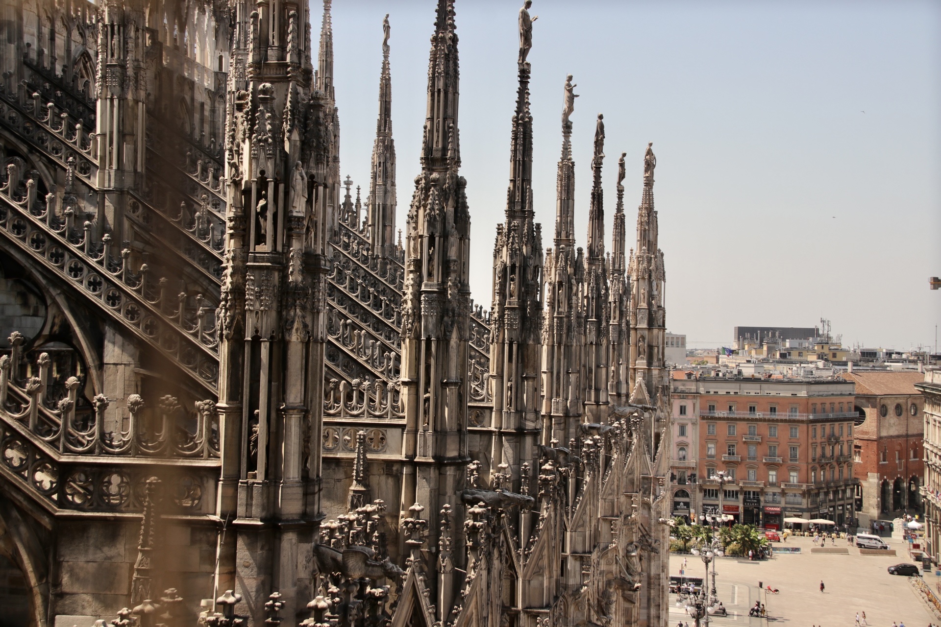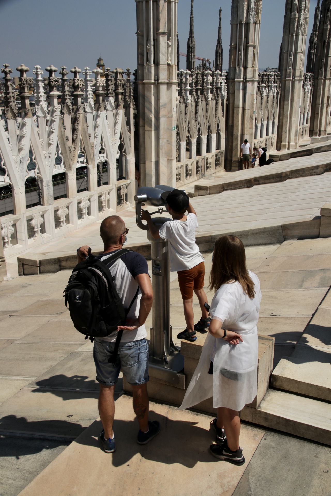 Um den Dom so richtig zu erleben, hatte ich, wie schon erwähnt, auch das Rooftop gebucht. Und damit wir den gesammelten Fahrstuhlkeimen entgehen, hatte ich für uns fleissige Wanderer die Treppenstufen als Aufstiegsvariante gebucht. In der Planungsphase klang das sehr logisch und sinnvoll. In der Mittagshitze war dies eine der schlechtesten Ideen ever. Wir kämpften uns 156 Stufen Richtung Sonne und je näher wir kamen, desto wärmer wurde es. Zwischenzeitlich befürchtete ich von Sonnenwinden gegrillt zu werden. Doch oben angekommen, hatte sich der Aufstieg wirklich gelohnt. Ein fantastischer Ausblick und wirklich ein einzigartiges Gefühl auf dem Dach des Mailänder Doms zu sitzen, während man die letzten Schlucke köstlichen Wassers als kaputter Hydrant ausschwitzt.