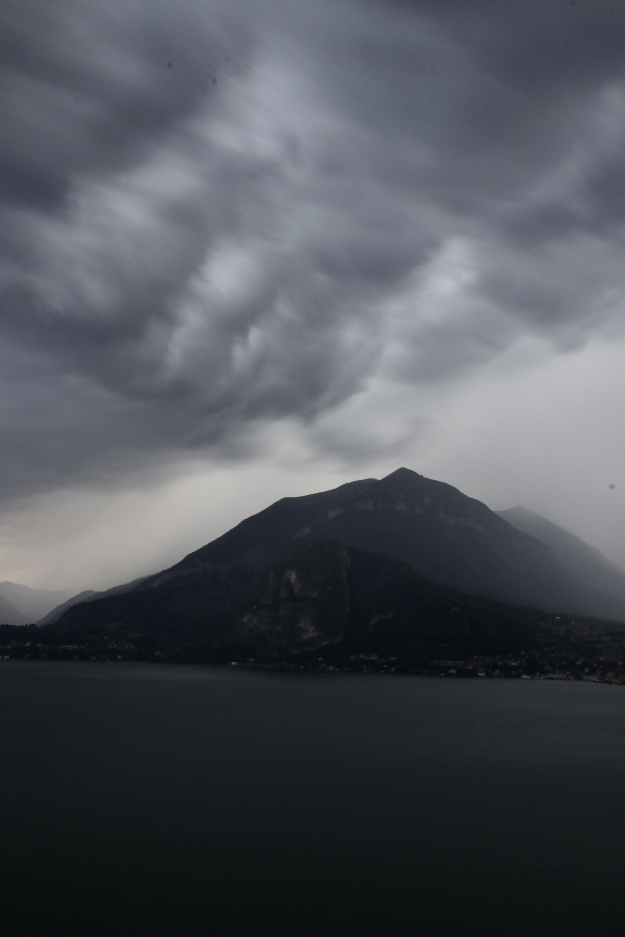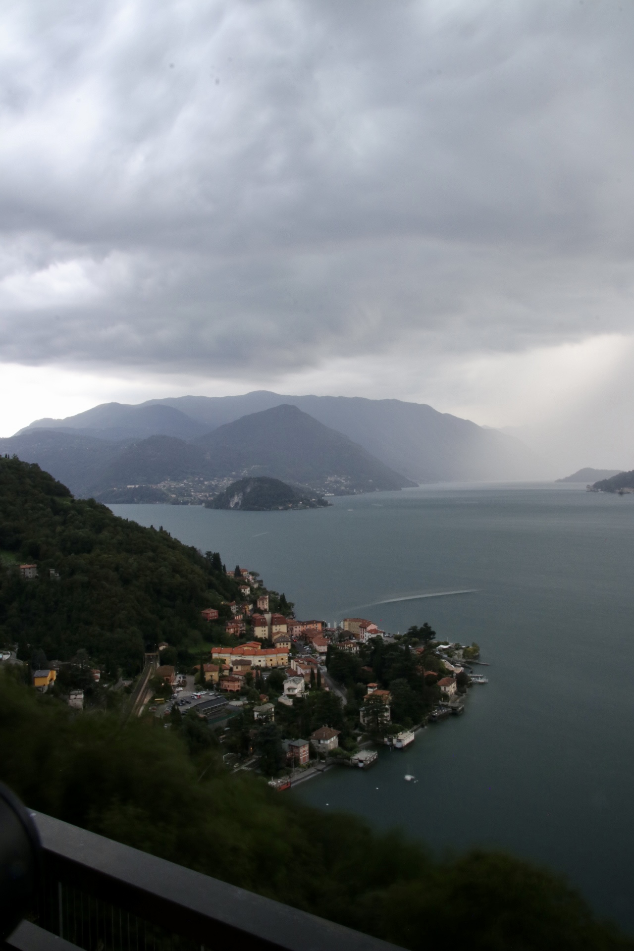 Natürlich hielt sich hier unsere Freude über die Absage in Grenzen, aber wie hätte es auch anders sein sollen: Der Comersee war halt verdammt traurig über unsere bevorstehende Abreise. Blöderweise sah es bis 17.00 Uhr eigentlich ganz harmlos aus und wir, inklusive unserem il Capitano jammerten rum. Doch kaum gejammert, zog über die Berge im Westen eine Gewitterfront in einem Tempo auf uns zu, dass wir uns auf unseren Plätzen in der ersten Reihe auf unserem Balkon glatt anschnallten. Okay, ich stellte noch schnell das Stativ neben mich und bereitete mich auf ein Stormchasing vor, man will ja alles im Bild festhalten.