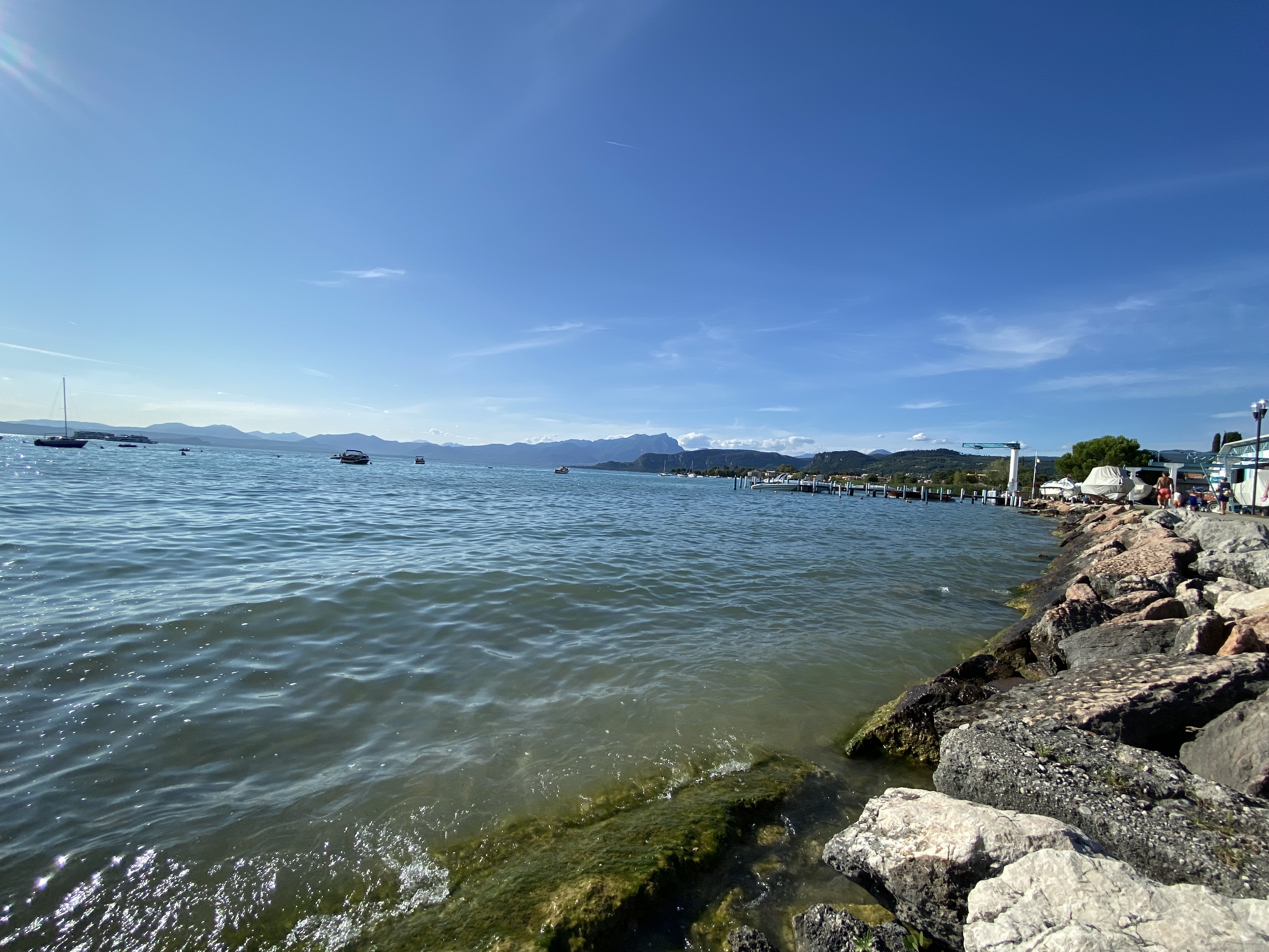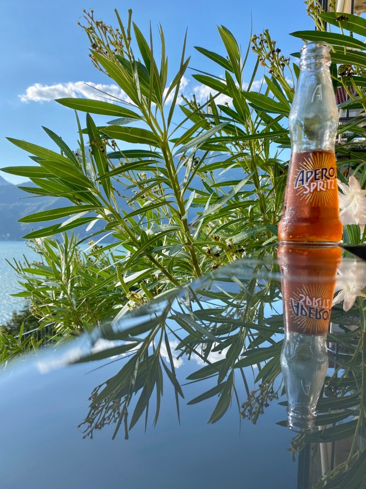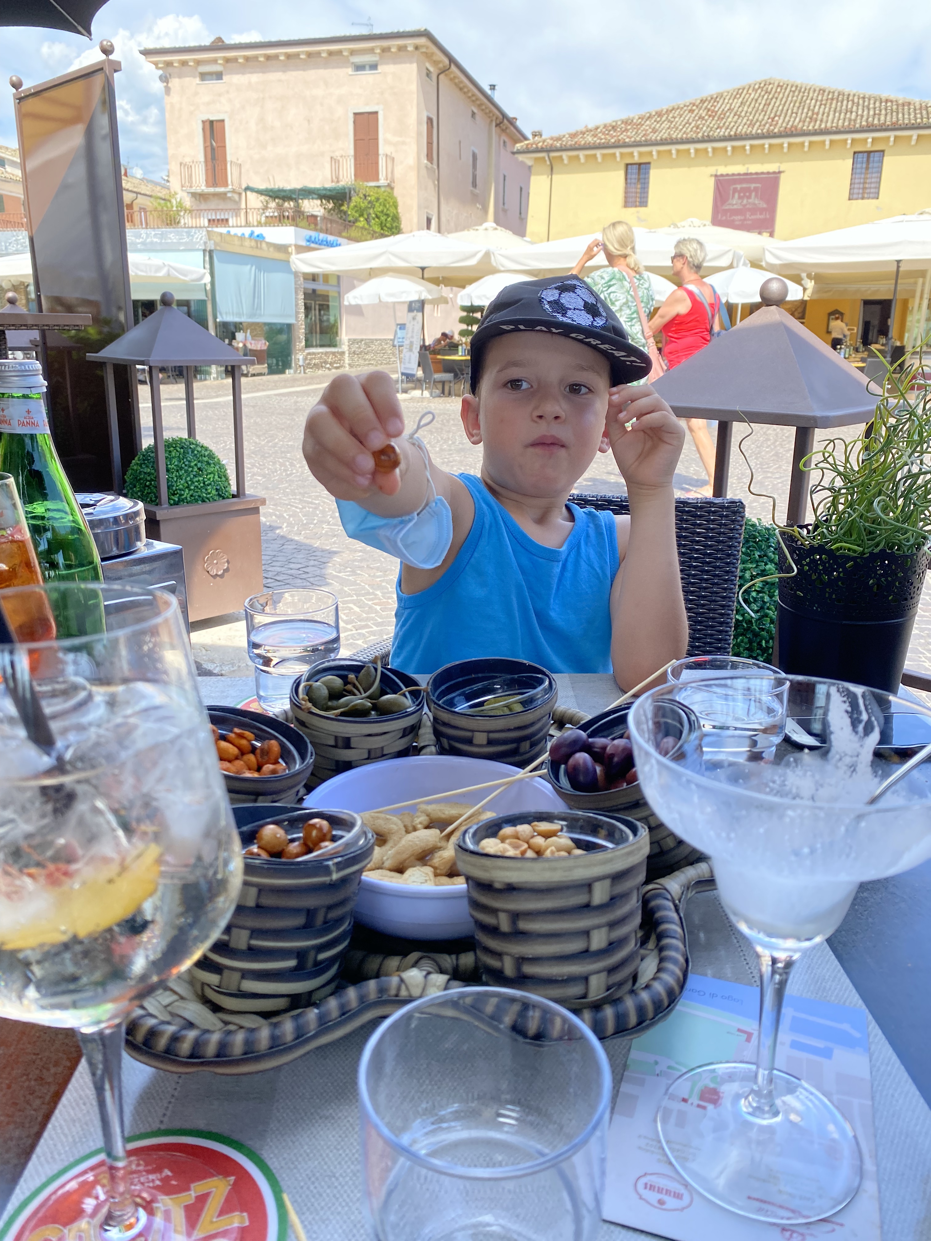 Jedenfalls empfing uns der Gardasee anschließend mit viel Sonne, Hitze und verdammt vielen Menschen. Nicht dass es am Comersee leer war, aber soviele Menschen hatten wir dann doch nicht erwartet. Aber wie unsere Große gleich sagte, war es einfach nur abwechslungsreich und wir machten uns einen schönen Nachmittag und Abend, inklusive Baden im See, a little bit shopping und 20.000 Schritten. Zwischendrin unterbrachen wir unseren Dauerlauf nur durch Essen, Wein, Eis und ein bissl Spritz. Dabei landeten wir in einer Bar, die eine ganze, und sogar dicke Karte voller verschiedener Spritz anbot. Mein Ehrgeiz war geweckt, aber bei der Hitze reichte es nur für einen Pfirsich-Spritz, den ich nur empfehlen kann.
