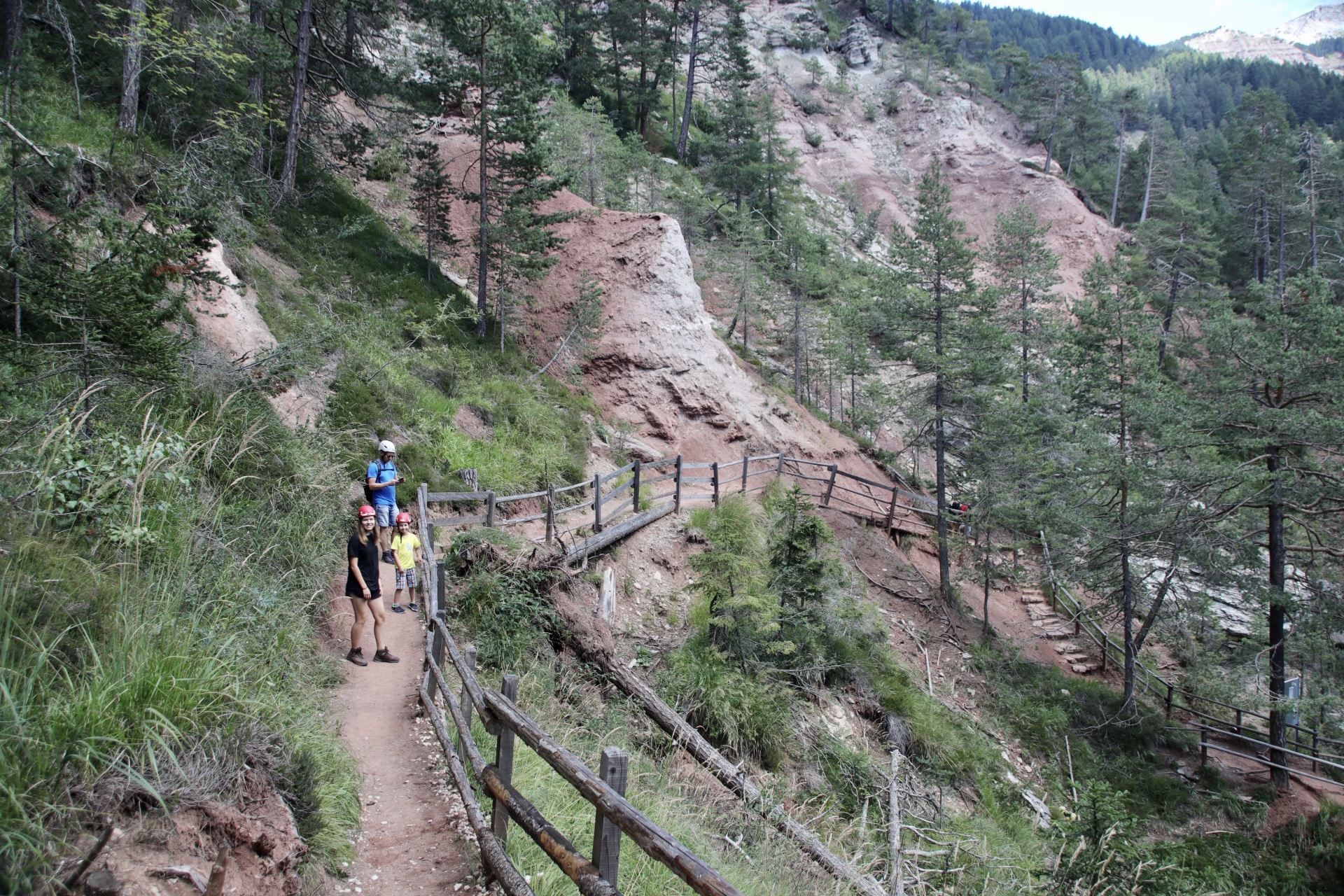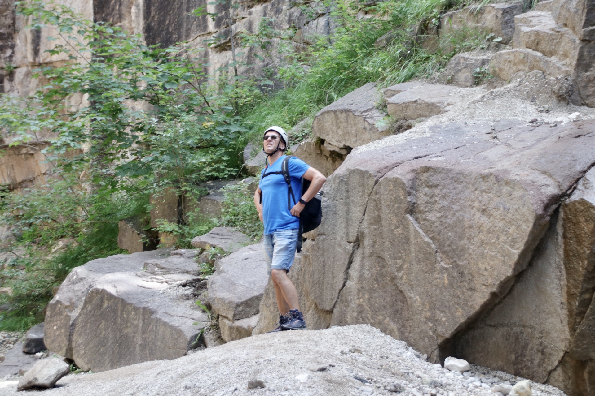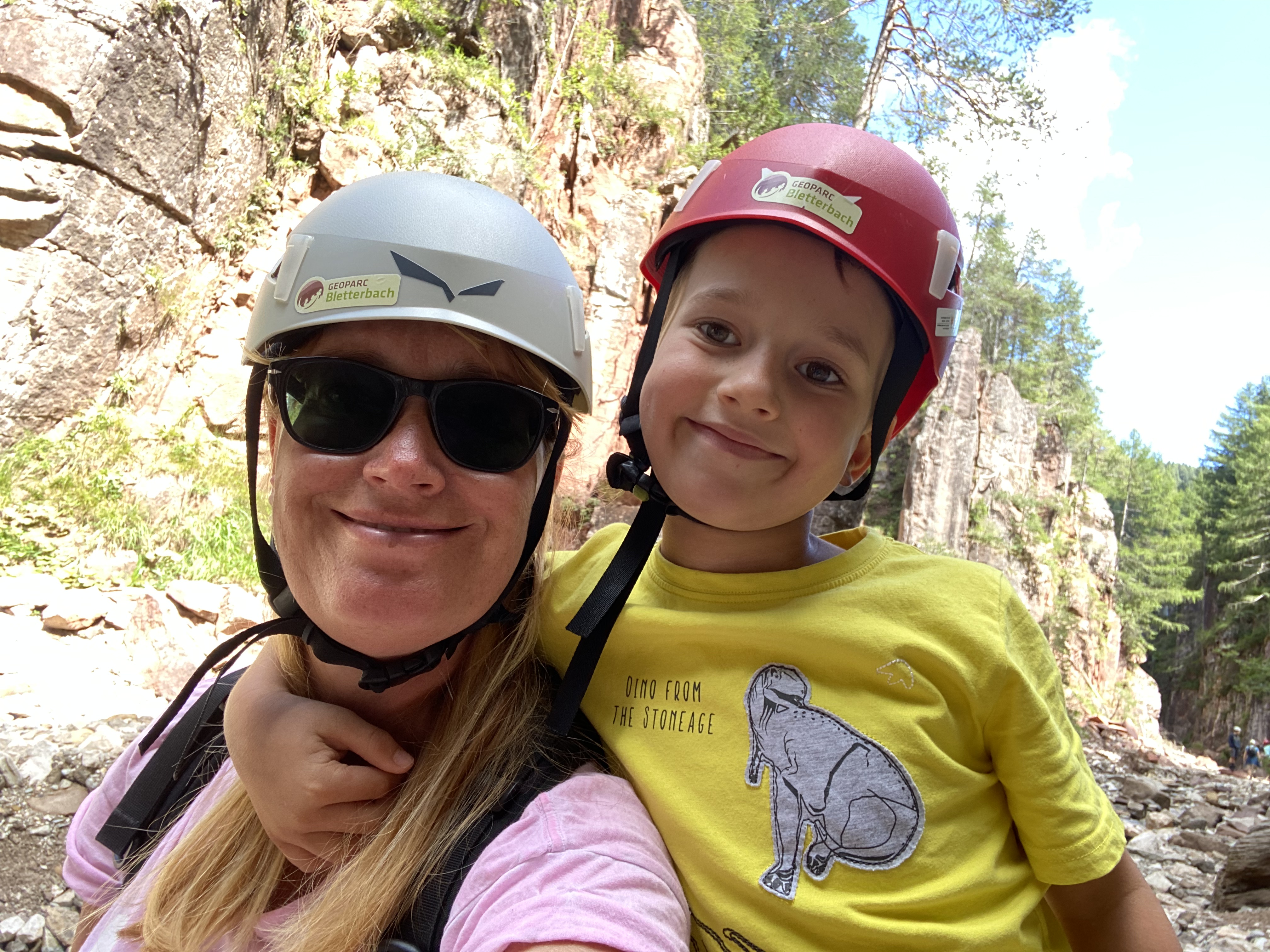Ab jetzt war ich keine gute Navigatorin mehr für Swen und so verließ er sich lieber auf das Auto. Und natürlich konnten wir auch den heutigen Fahrtag nicht ohne Aktivität durchziehen. Und so hatte ich uns eine Wanderung durch die Bletterbachschlucht südlich von Bozen ausgesucht. Der Vorteil, wir waren nicht von Seilbahnzeiten abhängig. Der Nachteil, um in eine Schlucht zu kommen, geht es verdammt tief um schlussendlich wieder hinauf zu gehen. Geholfen hat für meine Einstellung auch nicht die Helmpflicht, erstens nicht fotogen und ein Frisurenzerstörer und beim Fotografieren immer im Weg. Aber trotz dieser furchtbaren Nachteile war es eine tolle Wanderung und eine beeindruckende Schlucht. An den Wasserfällen durfte ich mich fototechnisch austoben, Georg liebte die Sprünge über den Flusslauf, Pini drehte Video’s, die meist ein „OMG“ von mir enthielten und Swen lobte mehrfach meine Wanderauswahl. Das nehme ich jetzt mal als Lob hin, genauso wie die Tatsache, dass wir es dieses Mal in der vorgegebenen Zeit schafften und uns nicht verliefen. War auch kaum möglich in einer Schlucht mit links und rechts ewig hohen Steilwänden, wo sollten wir schon hin.