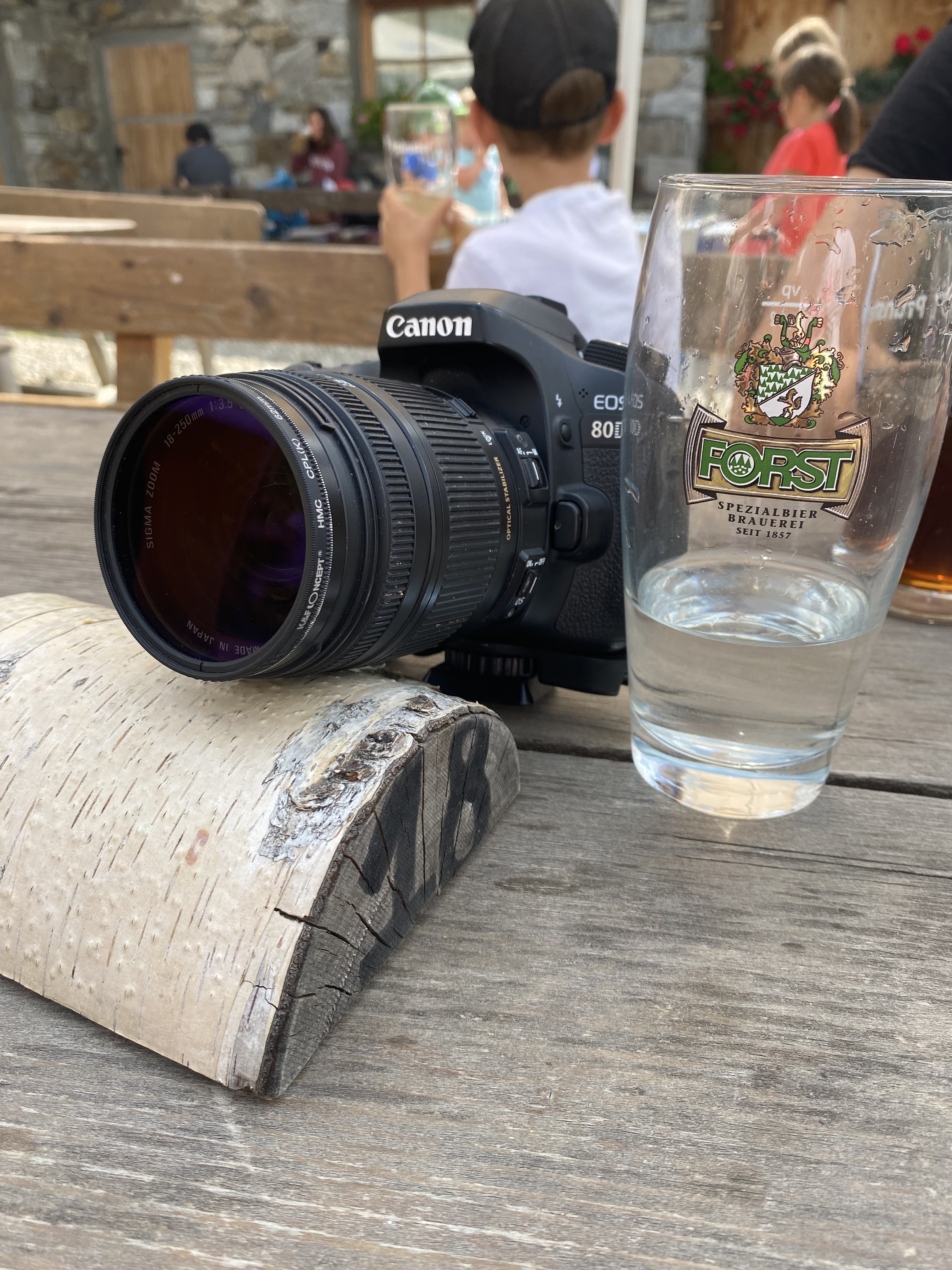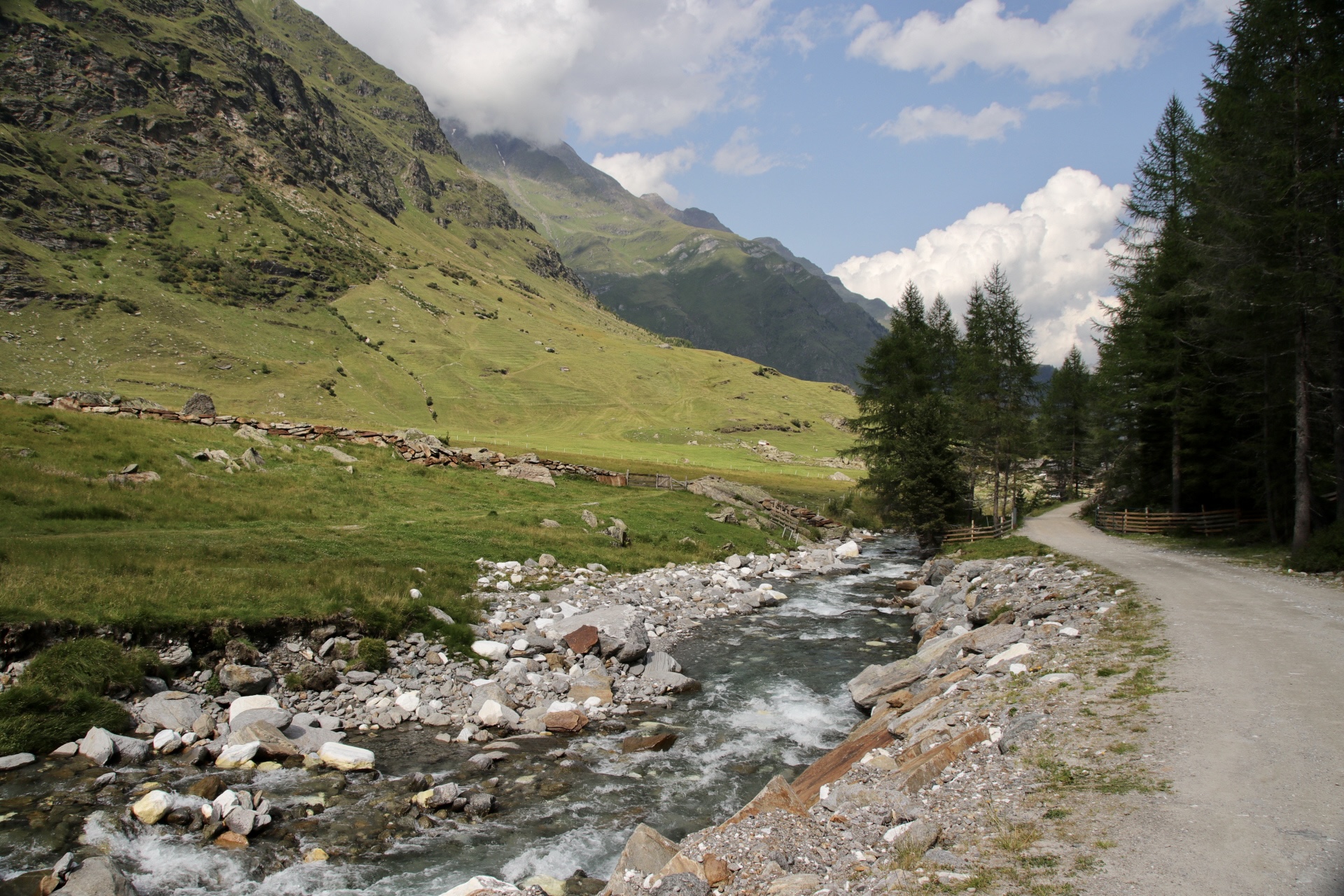 Weil mich hier mein schlechtes Gewissen plagte, bestellten wir lieber ne b’soffene Marille und betäubten das schlechte Gefühl. Eigentlich kann ich auf solchen Wanderungen nichts mit Alkohol trinken, weil dieser direkt in meine Beine fließt und die komplette Kontrolle übernimmt. Aber ein Marillchen hat noch keinem nachweislich geschadet und schließlich hatte ich ja meinen Marienkäfersturz schon hinter mir. Also nahmen wir Angriff auf die dritte Alm, die Lazinser Alm, wieder etwas bergauf. Und auf diesem Hinweg zeigte sich auch wieder, warum ich dieses Tal so liebe. Eingebettet in riesige Gebirgsketten schlingelt sich der Pfelderer Bach durch das Tal und das teils als ordentlich reißender Strom. Gleichzeitig gibt es einige Wasserfälle oder -fällchen und reichlich tolle Aussichten. Ich und mein Fotoapparat waren im Langzeitbelichtungshimmel. Um dass auszunutzen musste ich aber noch etwas Geduld zeigen. Also zuerst rauf auf die Alm und ein letztes Mal den Flüssigkeitsvorat auffüllen. Also so dachte ich zumindest.