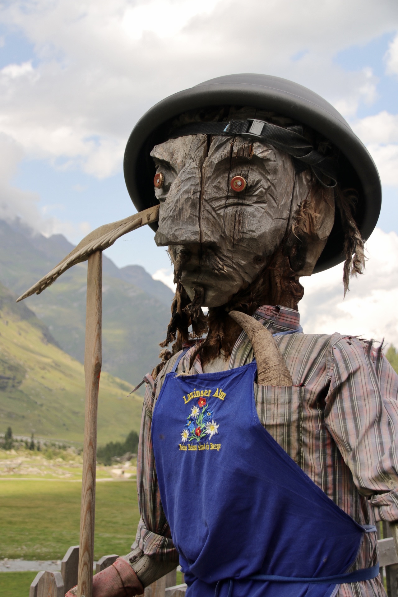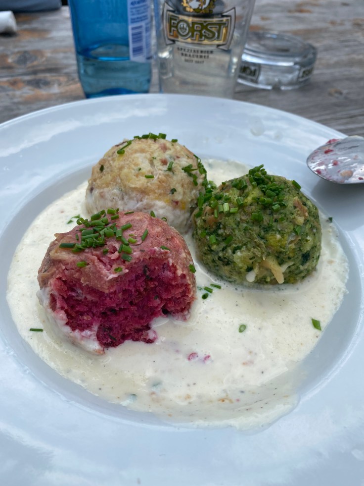 Irgendwann konnte ich mich wieder aufrichten, ohne als Stein ins Tal zu rollen und so ging es weiter zum Lazinser Hof. Meiner absoluten Lieblingsalm, wobei auch hier die Weltüberbevölkerung ihre Auswirkungen zeigt, denn von dem kleinem idyllischen Hof war kaum noch etwas übrig. Stattdessen wurde jede Abstellmöglichkeit für eine Biertischgarnitur genutzt. Doch das Essen war dafür extrem lecker. Ich wählte drei Knödel mit Gorgonzolasauce, ein grüner Spinatknödel, ein „weißer“ Speckknödel und ein roter Rote Beete Knödel. Ich finde, dafür das die Südtiroler eigentlich nicht zu Italien gehören wollen, war dies eindeutig die italienische Flagge in Knödelform. Vielleicht stammt der Koch eigentlich aus Italien und sendet so versteckte Botschaften der Reue und ein SOS. Wer weiß, ich habe nun aber die leckeren Beweise bis auf den letzten Happen verschlungen und somit sitzt der Koch weiter fest.