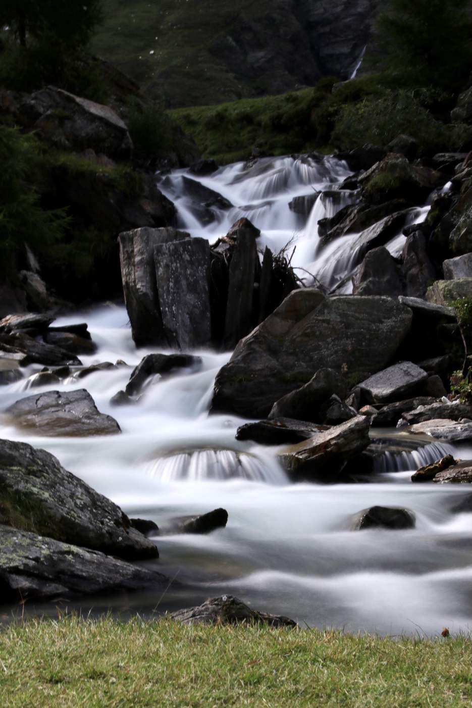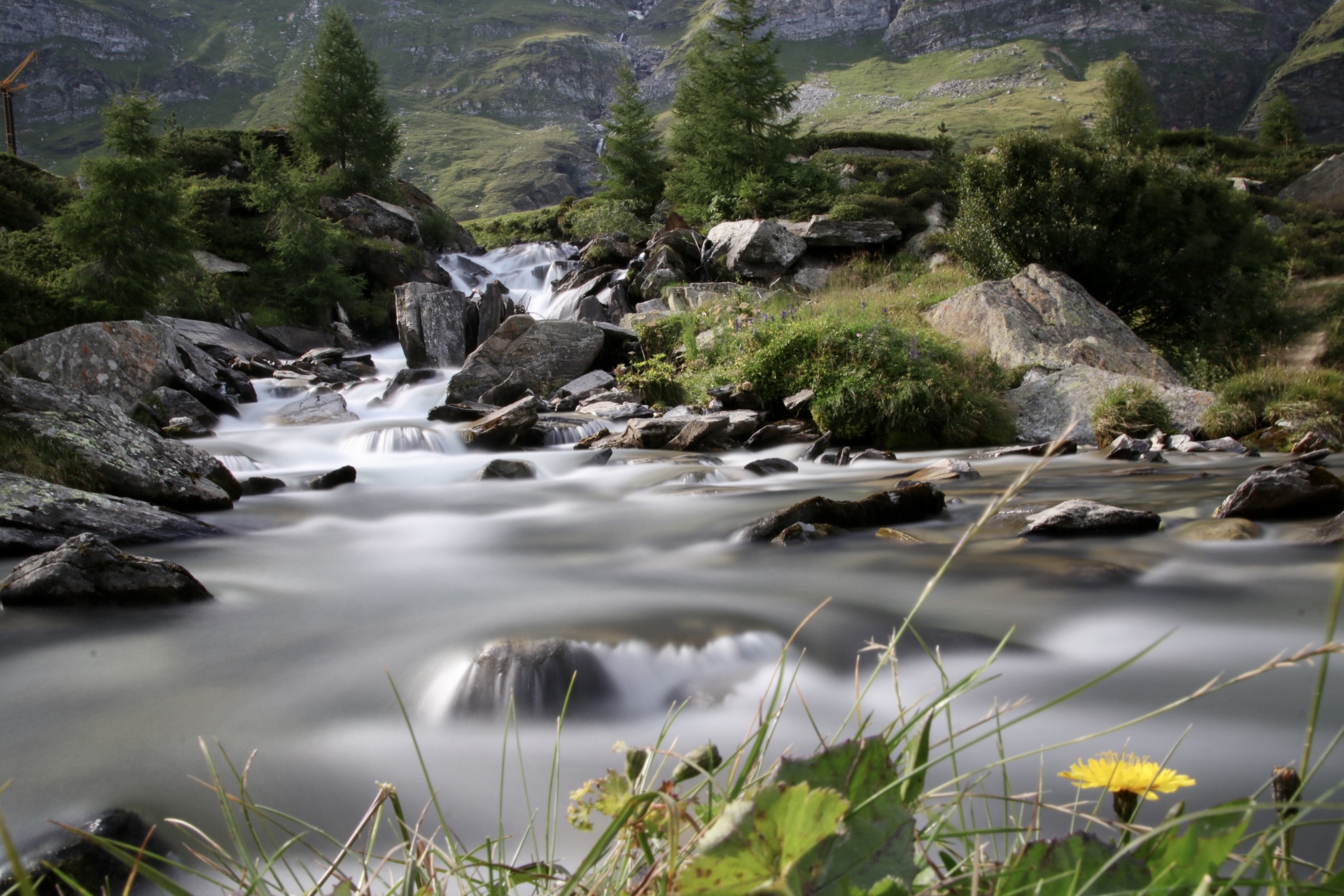 Ich trat dann mit 20 Minuten Vorsprung, was läppischen 10 Foto’s entspricht, den Rückweg an, während die anderen drei noch in Ruhe die Alm genossen. Ich stattdessen hechtete den ersten Kilometer hinunter als gäbe es kein Morgen und überholte alle anderen Spaziergänger. Nur um an einer wirklich sehr fotogenen Stelle zu rasten. Dort baute ich mich mit allen Tricks auf und belichtete im Minutentakt, während ich nebenbei die Aussicht genoss. Irgendwann kamen auch die Nachzügler und ich bekam noch Zeit für 2 weitere Aufnahmen, während sie um den Fluss herum Quatsch machten. Eigentlich war klar, dass irgendwann irgendjemand in diesem furchtbar kalten Fluss enden würde. Aber so als Elternteil an sich geht man ja doch mit einem gewissen Grundoptimismus heran. Wird schon nichts passieren. Bis jetzt ist es ja auch immer gut gegangen. Was soll schon passieren.