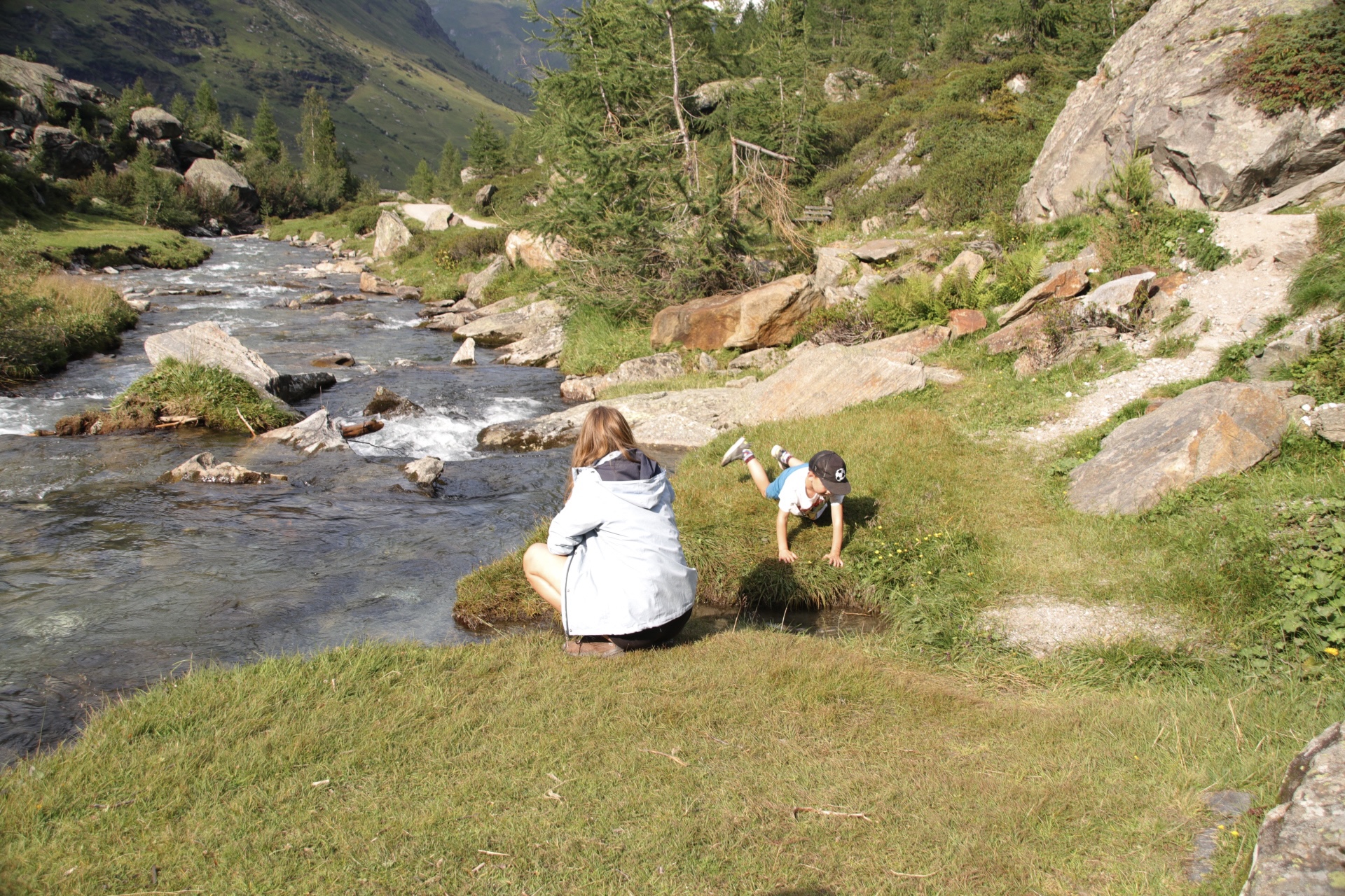 Als ich dann fertig geknipst hatte, packte ich wieder mein minimalisiertes, tragbares Equipment ein und war abmarschbereit. Georg wollte uns nur noch schnell zeigen, wie kalt das Wasser war, rutschte aus und stürzte mit den Armen voran in ebendiesen kalten Fluss. Bis zu dieser Sekunde war es noch ein lösbares Problem, denn bisher waren nur die Arme, das Gesicht und das T-Shirt nass und er übte Liegestützen mit Kühlung der Unterarme. Also hechteten wir hin mit den Worten: „Warte, bleib so!“ um ihn zu packen und zu retten. Und wie immer machen Kinder nie das was die Eltern ihnen sagen, schon gar nicht wenn das Wörtchen „Warte“ enthalten ist. Also setze der Reflex der Selbstrettung ein, was aber bedeutete, dass Georg mit den Füßen, inklusive Schuhen, in den Fluss sprang und rausrannte. Blöder Fehler, ganz blöder.
