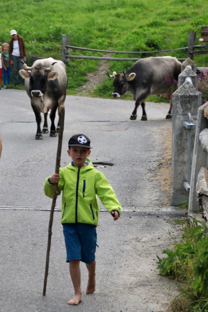 Nun sind ja die Zeiten wo ich mit einer kompletten Zweitausstattung rumrenne, für Windelunfälle oder ähnliches, schon lange vorbei und so konnten wir nur T-Shirt gegen Jacke tauschen und die Schuhe und Strümpfe schnell ausziehen. Und nun begann Georg’s Büßergang der falschen Entscheidungen. Insgesamt 4 Kilometer ins Tal über Stock und Stein. Georgs Babyfüße hatten somit ihr erstes Hornhauterlebnis und haben alles Babyhafte verloren. Wie bei einem Büßergang üblich, lief das Ganze aber ohne Jammern und Murren ab, sondern Georg ertrug sein Schicksal wacker und sang noch dabei. Und als wir in Pfelders dann noch Zeugen des Abendlichen Almabtriebs der Kühe wurden, ging Georg so barfuß wie er war glatt als Kuhhirte durch.