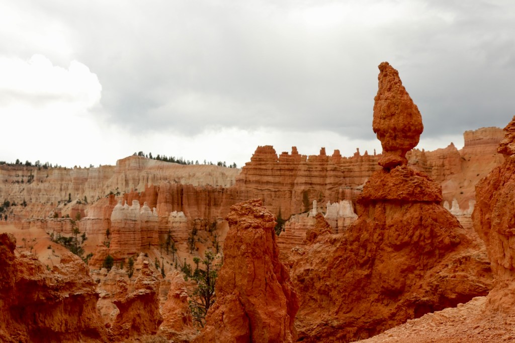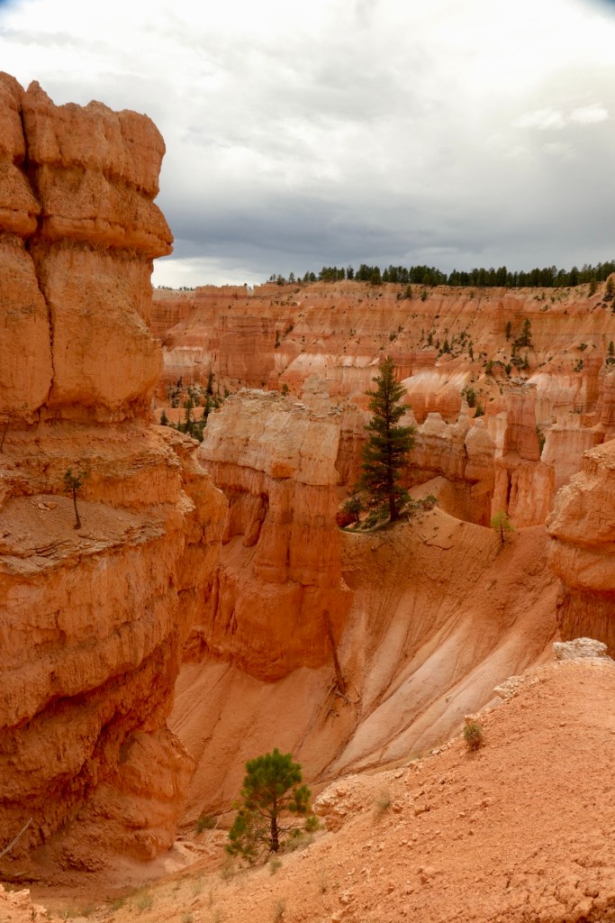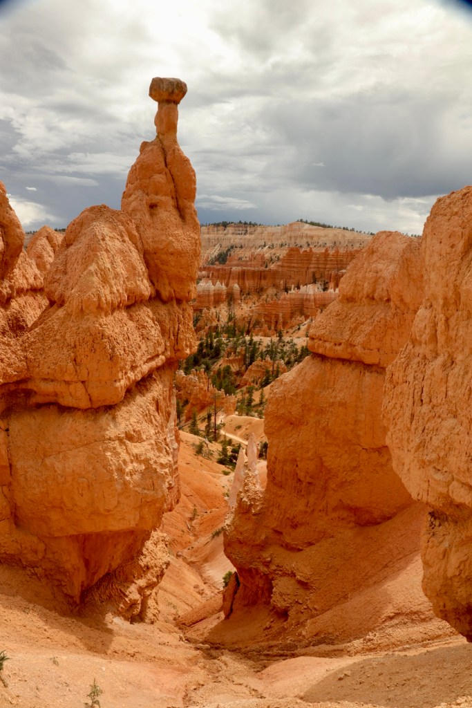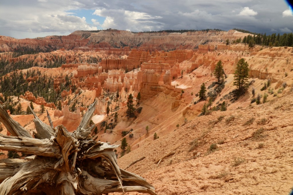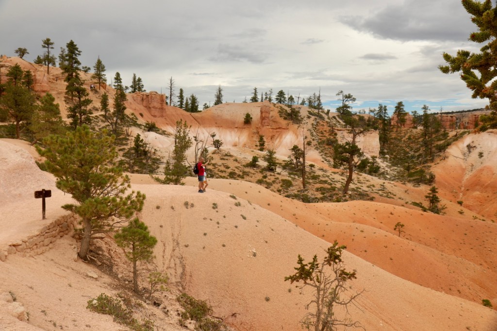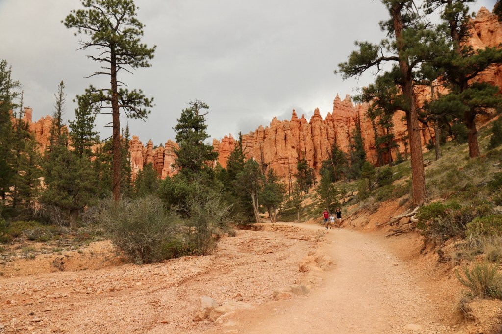 Aber bei allen Rachefantasien blieben wir natürlich brav, duschten und wechselten die Klamotten, um anschließend in den Bryce Canyon zum Wandern zu fahren. Wiedermal waren wir eingekreist von schwarzen Gewitterwolken und die Frage stand, ob Wandern ins Tal jetzt die kluge Wahl ist. Aber mit nun einigen Tagen Wettererfahrung wagten wir den Abstieg mit der Vorgabe, beim ersten Tropfen drehen wir um.
