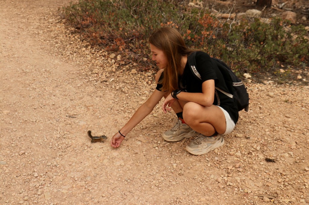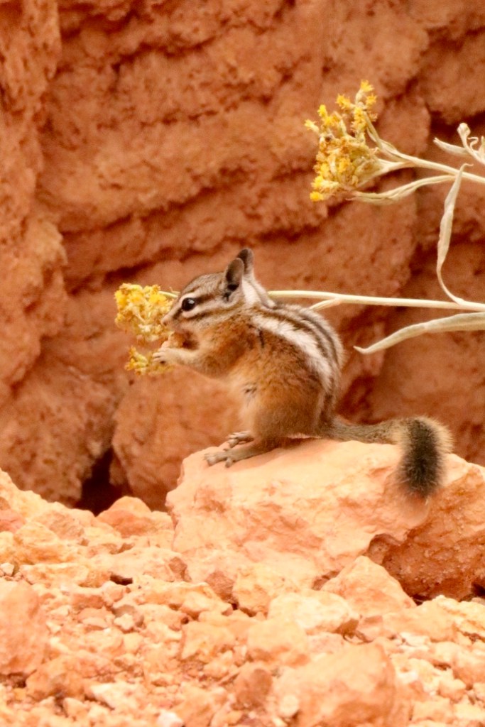 So ging es auf einen wunderschönen Rundweg, zuerst vom Sunrise Point auf dem Kamm zum Sunset Point, dann auf dem Navajo Loop Trail bzw. auf der Wallstreet hinunter ins Tal und dann über den Queens Garden Trail durchs Tal und letztendlich wieder hinauf auf den Kamm. Durch die Säulen oder Kleckerburgen des Bryce Canyon zu wandern ist noch einmal beeindruckender als nur oben am Kamm lang zu spazieren. Wir jagten wieder Fotohörnchen mit den Kameras und hielten Ausschau nach Puma’s, aber fanden Gott-sei-Dank nur die zahlreichen Fotohörnchen.