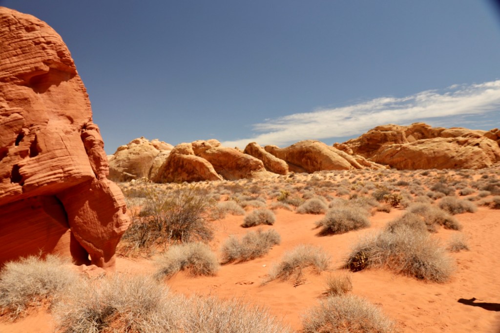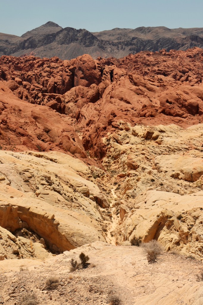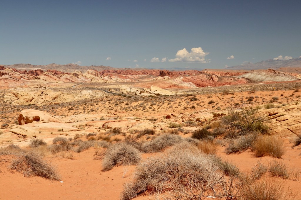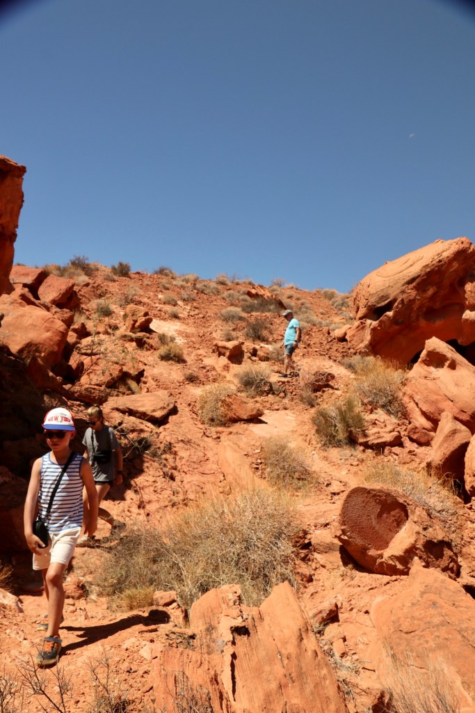 Aber das Valley of Fire hat ja mehr zu bieten, als diesen Elephant Rock. Also ging es weiter zum nächsten Viewpoint bzw. Ausgangspunkt für eine klitzekleine Wanderung von 2 Kilometern. Dieses Mal schafften wir jedoch nur rund dreihundert Meter, dann waren wir so erhitzt, dass wir freiwillig aufgaben. Wenn man Angst haben muss, dass man einfach so verglüht wie eine Sternschnuppe, ist es einfach vernünftiger umzukehren und sich ins fahrende Gefrierfach zu legen. Also genossen wir ab jetzt nur noch die Viewpoints, die direkt am Parkplatz lagen. Alle anderen Wanderwege waren eh gesperrt wegen der Hitze. Was mich aus Fotografensicht zwar ärgerte, aber mich als Mutter eher beruhigte.