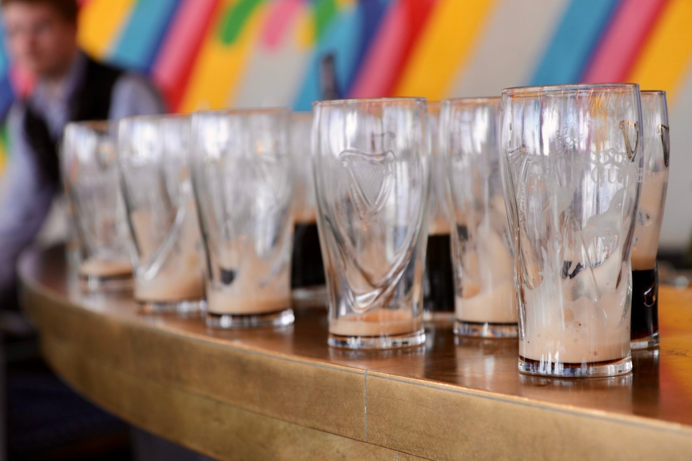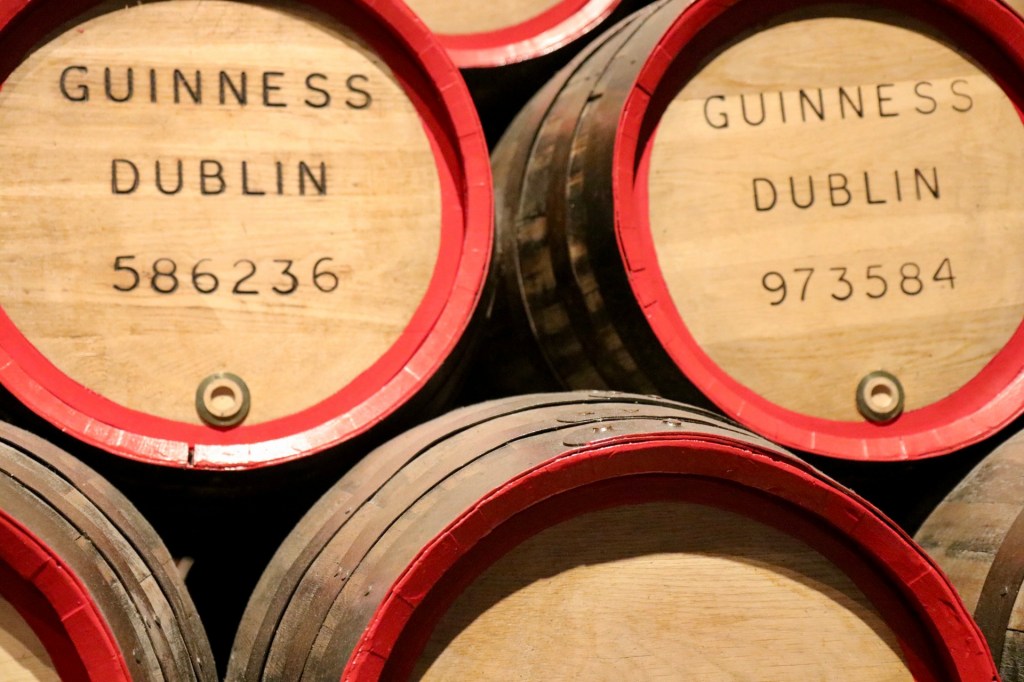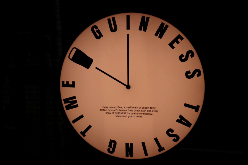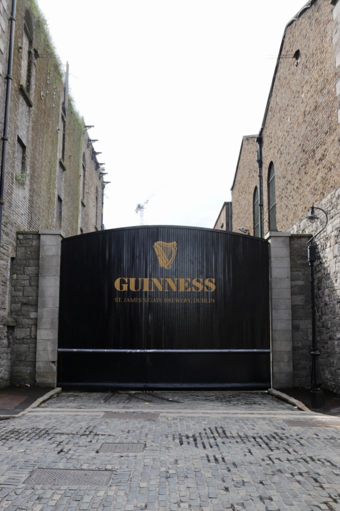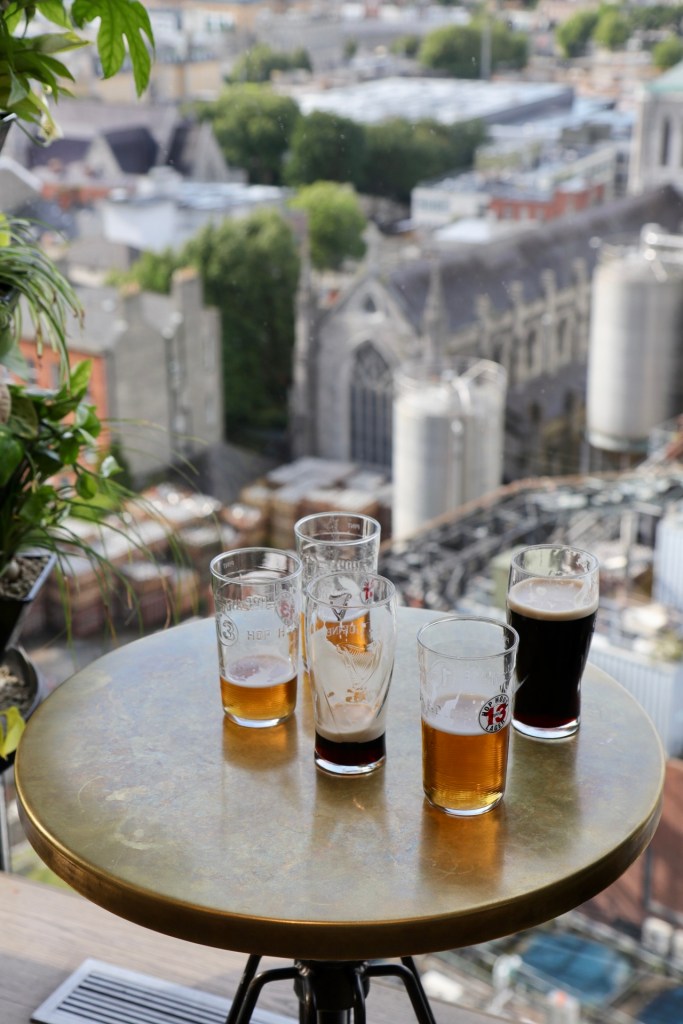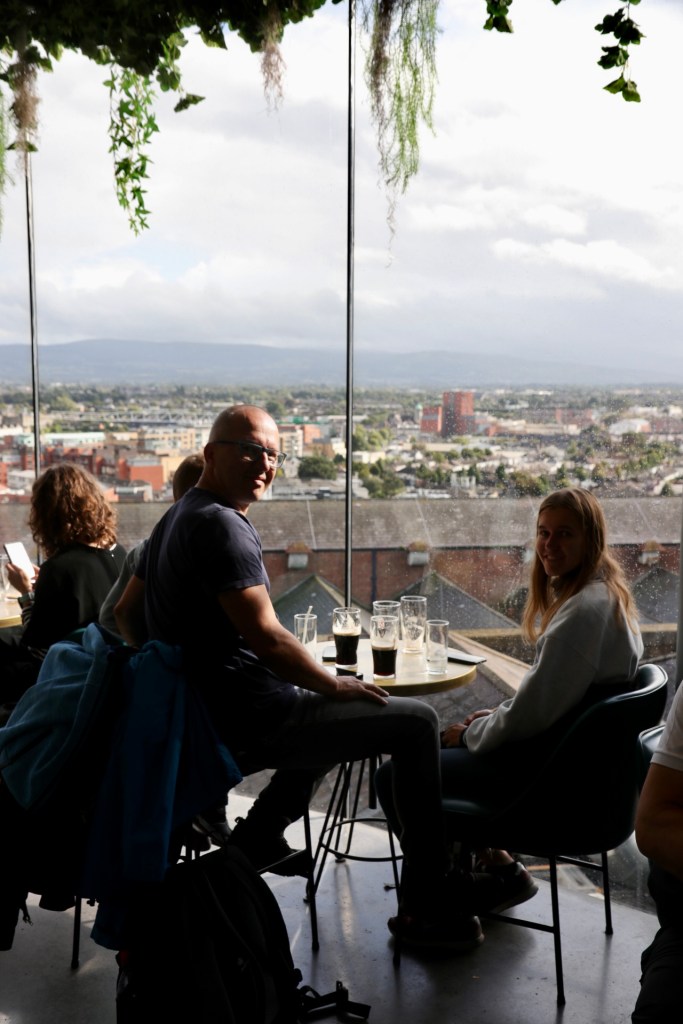 Aber um dieses Mal einen Schlusssport zum nächsten Termin zu vermeiden, trennten wir uns irgendwann vom Busfahrer und liefen quer durch die Stadt zur übermächtigen Guinness-Brauerei und unserem nächsten Sightseeing-Termin. Eigentlich ist es ja nicht nur eine Brauerei sondern eine ganze Stadt, die hier allgegenwärtig ist und so hatten auch wir uns Tickets für die Merchandising-Gelddruckmaschine besorgt. Wahnsinn, was hier für die Touristen zum Thema Bier auf die Beine gestellt wird. In einem riesigen Gebäude, welches den Uraltcharme mit modernster Architektur verbindet, wird einem bildlich und zum Anfassen alles zum Thema Brauerei erläutert. Man kann die Gerste anfassen, das Wasser hören und spüren, den Hopfen riechen und so wichtige Tatsachen erfahren, wie dass 3 Millionen Blasen in einem Pint Guinness tanzen. Ein Merchandising-Erlebnis der besonderen Art. Es gipfelt, und das kann man wörtlich nehmen, in der Roof-Top-Bar auf dem Dach, wo man mit Rundumblick, einem DJ und zahlreichen Zapfsäulen dazu gebracht wird, 1-10 Guinness zu trinken. Wir haben ganz tapfer zwei Sorten verköstigt und die ersten Sonnenstrahlen unserer Reise durch Irland genossen. Da sagt man doch: