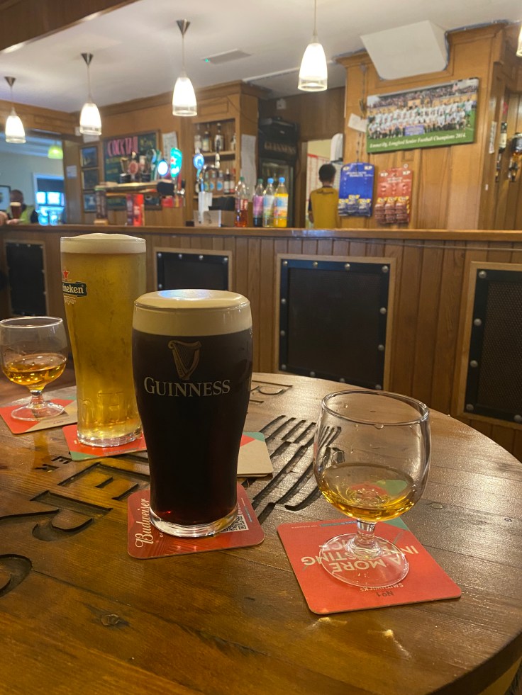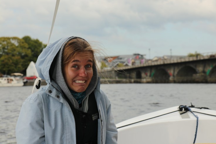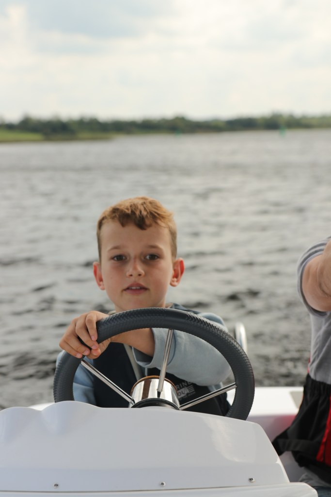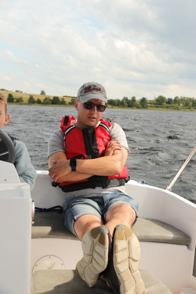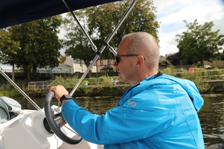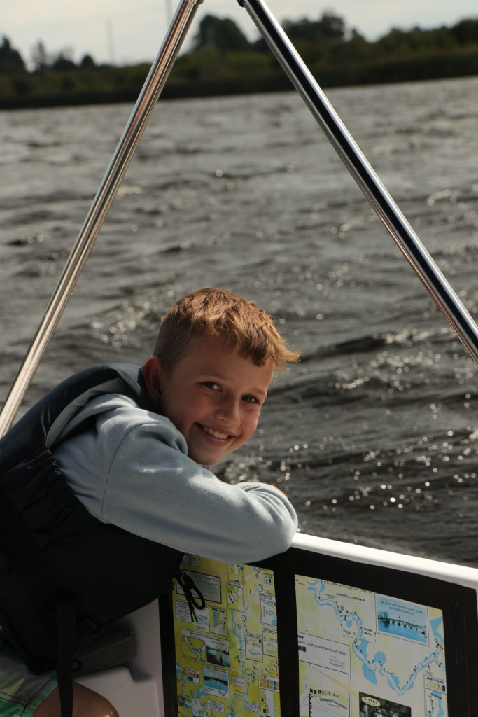 Also wurden wir zum Kapitän und fuhren auf dem Shannon entlang. Wir hatten uns für eine Tour in den See Drumharlow entschieden, die Sonne schien, es wehte nur eine leichte Briese und nichts konnte schief gehen. So durften auf dem Fluss auch mal alle von uns den Kapitän spielen. Georg konnte es kaum abwarten und er war ein guter Kapitän. Auf dem See war dann auch Pini dran und drehte als erstes mal ein paar Pirouetten. Auch das haben wir überlebt. Doch gleich danach ging plötzlich gar nichts mehr. Wir streiten immer noch, ob sich was in den Motor verfangen hatte, oder ob einfach der Gegenwind so stark war, dass unser Motor schlapp machte. Fakt war jedenfalls, dass wir uns gefühlt keinen Meter bzw. keine Delphinlänge mehr bewegten, während alle anderen Boote an uns vorbei zogen. Allerdings muss man wirklich erwähnen, dass vom gelobten Sonnenschein und der Windstille nichts mehr übrig war. Der Himmel war dunkel bewölkt, der Wind kam konstant von vorne und die Temperaturen waren flöten gegangen. Inzwischen hatten wir statt uns in die Badeklamotten zu schmeißen, alles angezogen, was wir mithatten, inklusive der Badehandtücher und hofften nur noch, uns auch nur einen Meter Richtung Hafen bewegen zu können.
