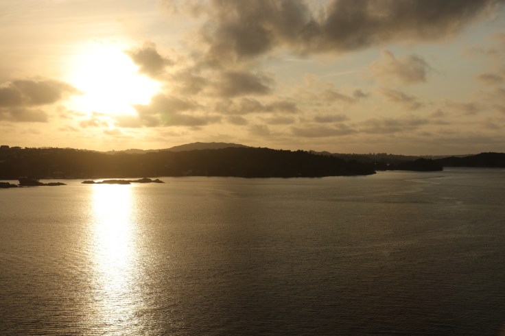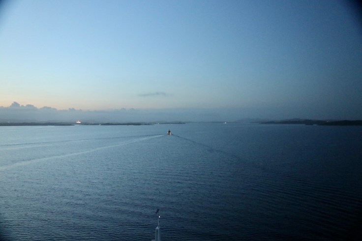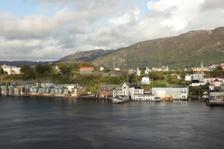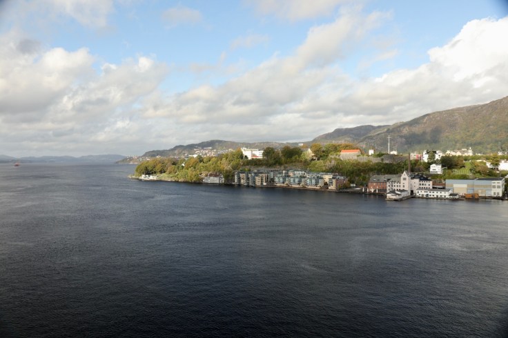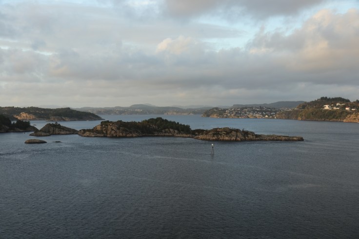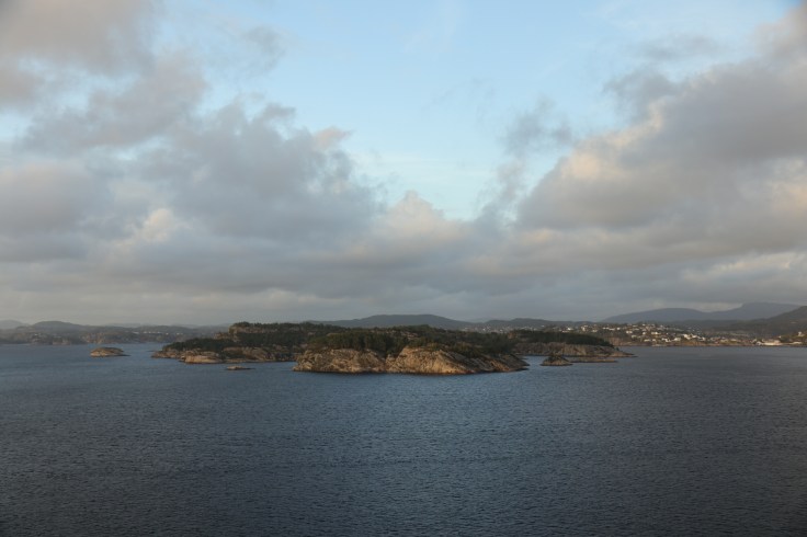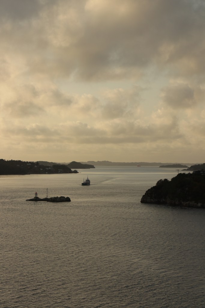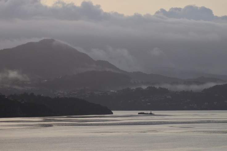 Der Tag begann mit einem frühen Weckerklingeln um 6:30 Uhr, denn wir wollten unsere erste Einfahrt in einen Hafen garantiert nicht verpassen. Bei einem Blick auf den Balkon waren wir augenblicklich munter. Denn erstens war es saukalt im Negligee und zweitens hatten wir nasse Füße, weil es offensichtlich geregnet hatte. Hier war also das typisch norwegische Herbstwetter. Sooooo schön. Also erst einmal eine Jacke überwerfen, die Mütze aufsetzen und wasserdichte Schuhe anziehen und dann den zweiten Versuch der begleiteten Hafeneinfahrt starten. Ging dann auch besser. Und so wurde es langsam immer heller und schöner. Der Lotse machte irgendwann auch den Blick frei und wir genossen einfach die tolle Stimmung und ich strapazierte meinen Fotofinger bis zum Muskelkater.