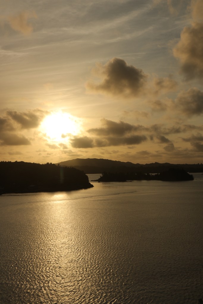 Aber irgendwann waren auch wir des Laufens müde und steuerten wieder unser Schiffchen an. Es fühlte sich in der Schlange, ja sie hatte uns wieder, an, als würden wir nach einem verdienten Freigang wieder zurück müssen. Die Kette mit dem Bordpass wurde umgehängt und mir brauch keiner erzählen, dass sich dies nicht wie eine kleine Inhaftierung nach dem Freigang anfühlt. Da hilft nur, schnell ein Aperölchen besorgen und die Ausfahrt auf dem Balkon genießen. Schon war dieses Gefühl verflogen bzw. weggesoffen. Die Ausfahrt belohnte uns dann noch mit einem traumhaften Sonnenuntergang und so waren wir wieder seelig auf unserer Aida.