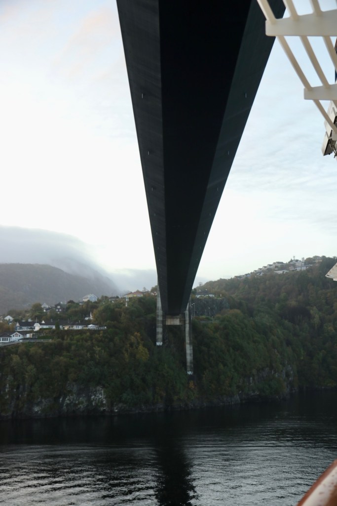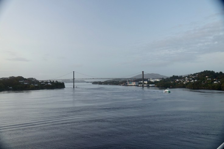 Kurz vor dem Hafen mussten wir noch eine riesige Hängebrücke durchqueren und bei aller Liebe, ich war mir trotz optimistischer Grundeinstellung gar nicht sicher, ob wir das schaffen würden. Schließlich trifft hier eine fahrende Kleinstadt auf eine Hängebrücke. Aber an der Stelle kann ich alle Mitleser beruhigen, wir haben es geschafft. Wäre es nicht so, würde ich ja jetzt mit meinem Laptop auf einer Tür durch den Fjord schippern und darauf achten, dass mein Mann mich nicht ins Wanken bringt. Übrigens, im Ernstfall würde ich natürlich den Laptop loslassen und meine schwimmende Tür mit meinem Mann teilen. Also falls er lieb ist…