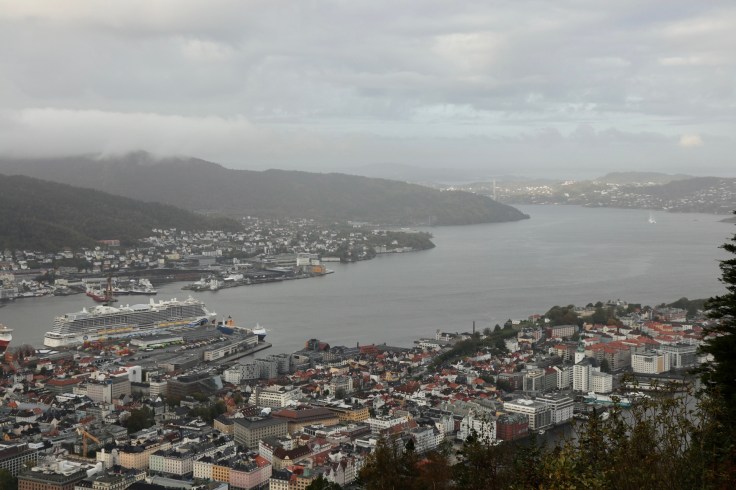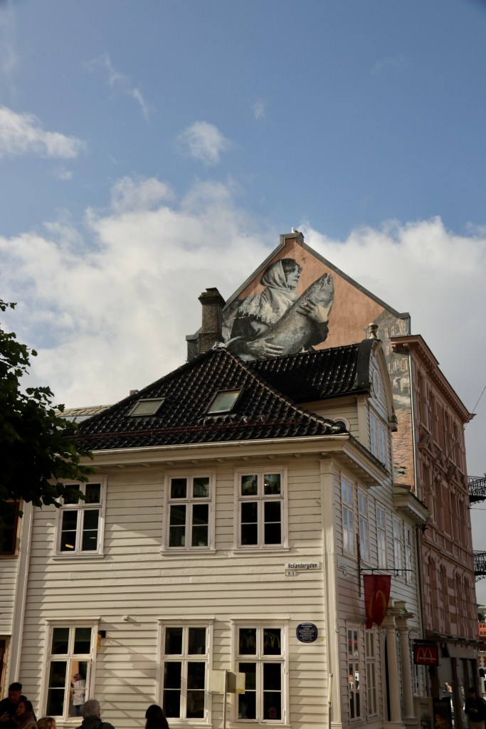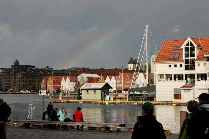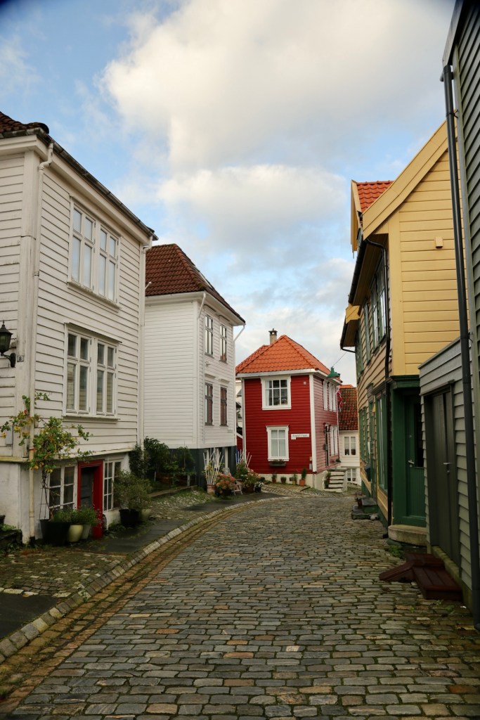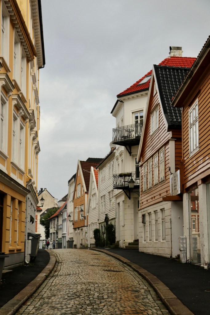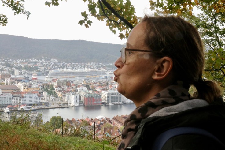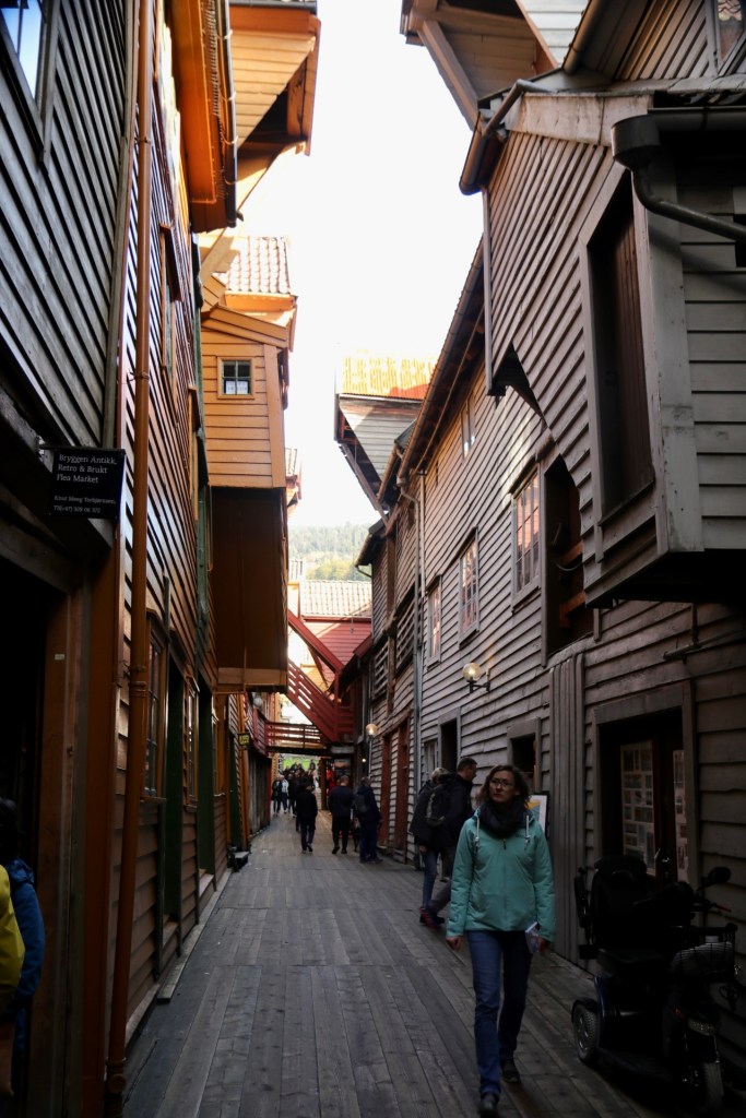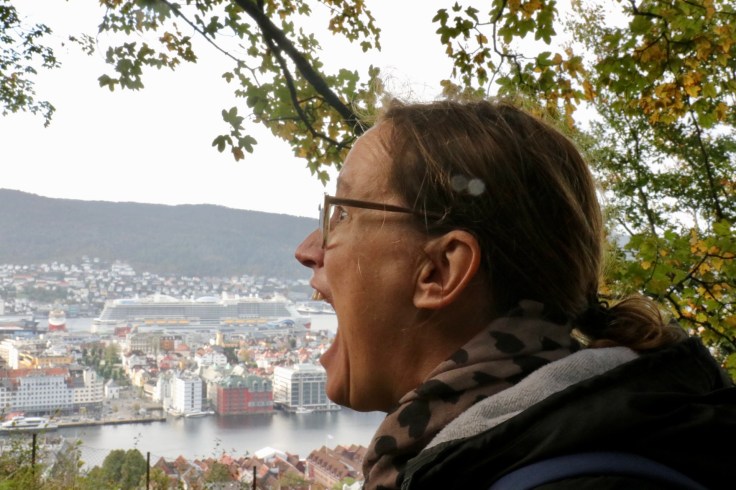 Nach dem anschließendem, frühmorgendlichen Kampf am Buffet verließen wir erstmalig das Schiff, um uns Bergen anzusehen. Das war eine Bewegung wie die Lemminge auf Landgang oder eine Ameisenstraße auf Tagesausflug. Da half nur eines: An der ersten sich bietenden Ecke, einfach dem Rudel entfliehen und in die gegengesetzte Richtung ausscheren. Man glaubt es nicht, aber so waren wir tatsächlich innerhalb von Sekunden plötzlich unter uns. Ganz alleine in einer fremden Stadt, verrückt. Ein irres Gefühl, dass wir nur überleben konnten, indem wir den ersten Touristen auf dem Weg ein ungewolltes: „Sollen wir sie mal fotografieren?“ entgegen bretterten. Ganz ohne soziale Kontakte können wir schon nach nur 48 Stunden nicht mehr. Wie soll das nur enden?