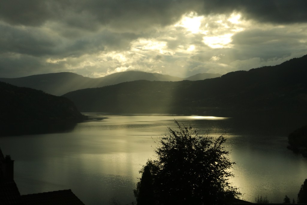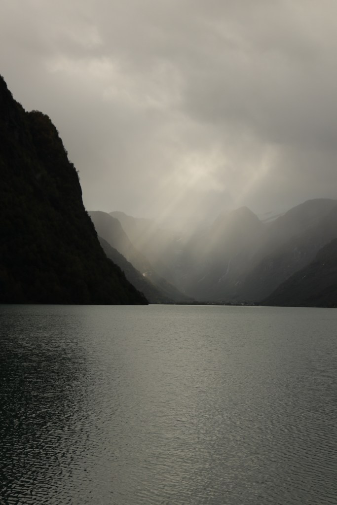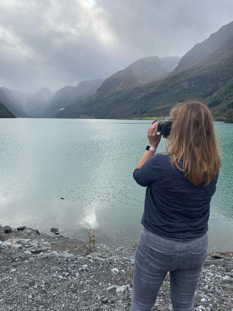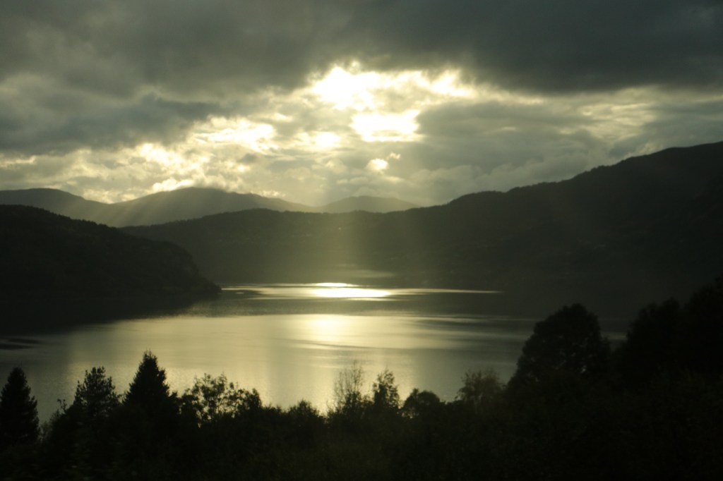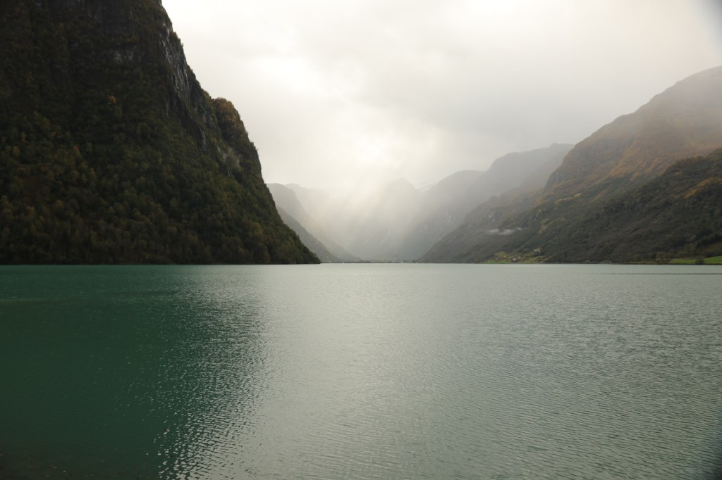 Doch zuerst einmal fuhren wir entlang dieser traumhaften Landschaft am Fjord entlang. Und ich litt Höllenqualen. Denn wären wir mit dem Auto, so wie immer, unterwegs gewesen, hätte mein Mann schon mindestens 10 Zwangsstopps zum Fotografieren einlegen müssen. Die ersten 8x hätte ich natürlich behauptet, dass ich pullern muss, oder mir furchtbar schlecht wäre. Nur um die dringende Notwendigkeit zu unterstreichen. Aber ich schätze, nach dem 6. Stopp ohne Pippi, wäre er mir auf die Schliche gekommen. Aber in meinem großen Kompromiss-Fahrzeug hielt keiner für mich an und das war die Höllenqual. Denn die Landschaft schrie förmlich nach meinem Fototalent und wollte unbedingt im Bilde festgehalten werden. Erschwerend kam hinzu, dass ich auch noch auf der falschen Seite und im Gang saß, was das Fotografieren durch das Busfenster nahezu unmöglich machte. Aber trotz lauten Schluchzens hielten wir erst 15 Minuten vor dem eigentlichen Ziel mal an. Ich werde bestimmt den Anbieter für den Missbrauch der Mehrzahl von Fotostopp verklagen. Dass kann er mit einem Herzensfotografen wie mir nicht machen.