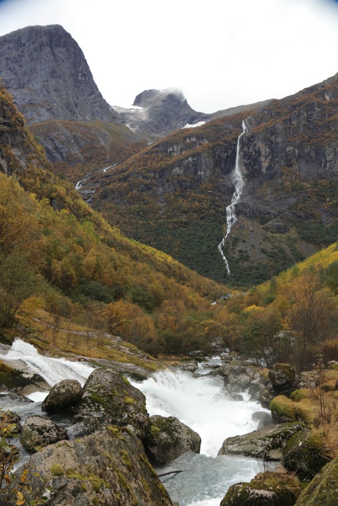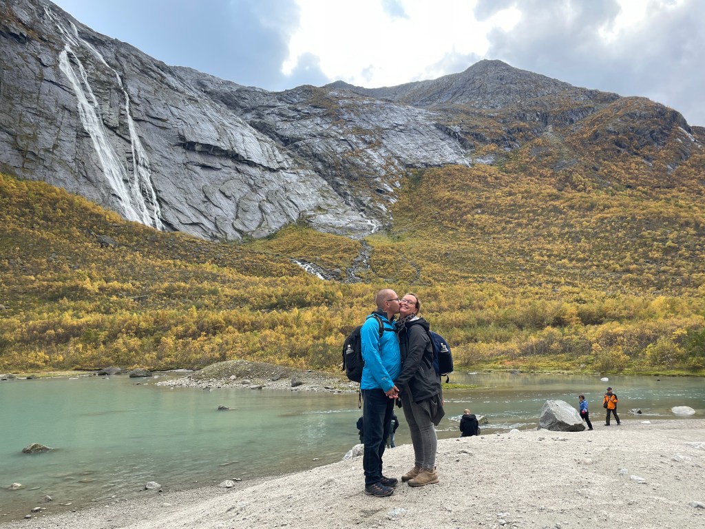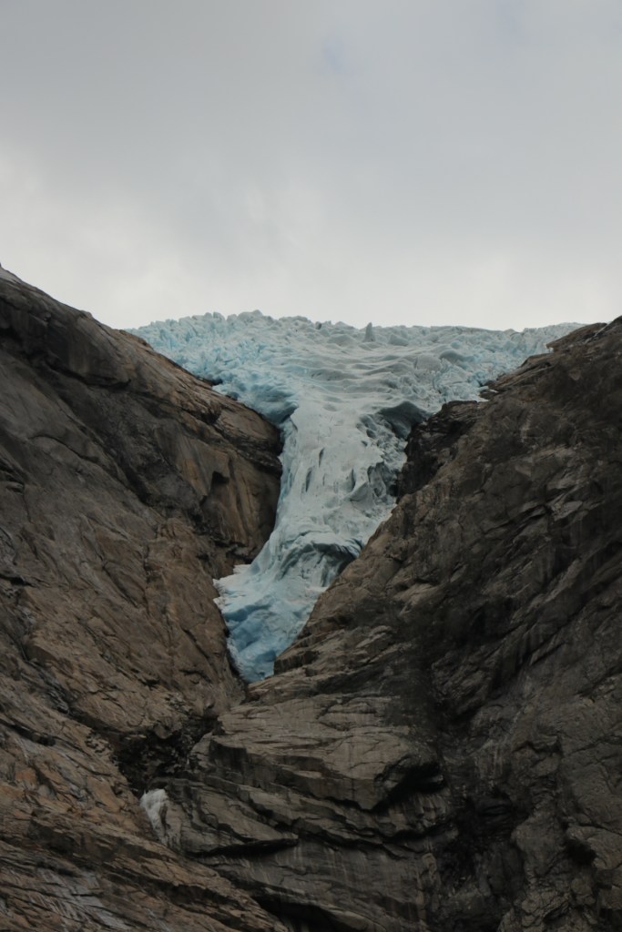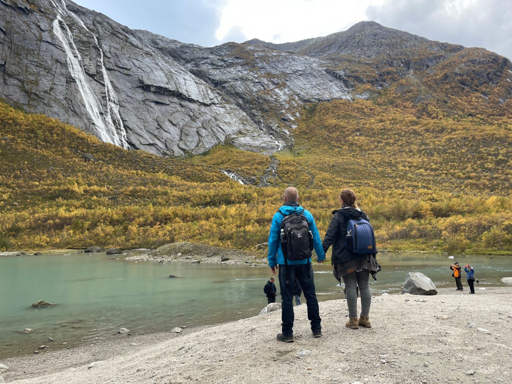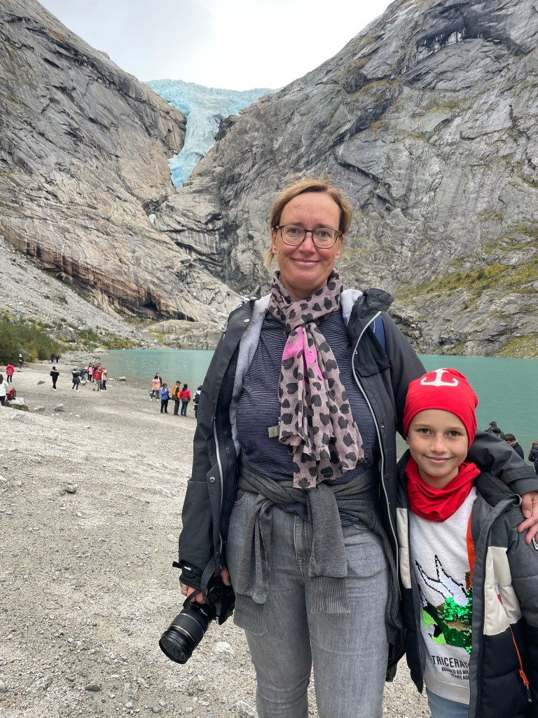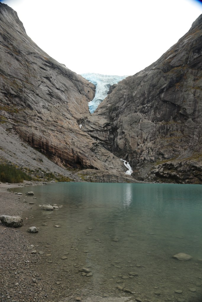 Aber dieser eine winzige, kurze Fotostopp besänftigte mich dennoch, genau wie die Aussage, dass wir gleich am Briksdal Gletscher ankommen werden. Endlich kein Fenster mehr vor der Linse und freier Auslauf für meine Spezies. So liefen wir auch gleich los, während sich ein gutes Drittel zum Kuchenbuffet absetzte, ein weiteres Drittel die Toiletten aufsuchte und weitere 20% die Variante des mobilisierten Zubringers wählte. Also Läufer wie wir waren es tatsächlich nicht so viele.