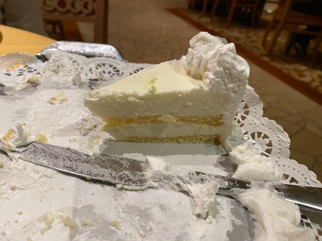 Und so ging es los zum Kampf am Buffet. Heute hatten wir die falsche Zeit für unseren hungrigen Auftritt gewählt. Entweder gab es keinen freien Platz oder die Tische waren nicht abgeräumt. Also so etwas wie Handtücher auf dem Stuhl. Aber erst einmal hinsetzen. Georg besorgte uns einen Kellner, der alles wegräumte, was nicht uns gehörte und dafür Wasser und Wein brachte. Nur mit den Gläsern hatte er es nicht so. Also bettelte ich am Nachbartisch um ein Weinglas. Ich wollte es mir borgen und garantiert später benutzt zurückbringen. Der Lacher war auf meiner Seite und das Eis gebrochen. So erfuhr ich auch, dass hier ein Geburtstagskind am Tisch saß. Also lieb gratuliert und formuliert, dass ich gnädiger weise jetzt mal kein Ständchen singe. Dafür bekamen wir dann sogar die restliche Torte geschenkt. Mal ehrlich, soviel Angst muss man vor meinem Gesang nun wirklich nicht haben, dass man mir Geld in Form von Kuchen bietet. Aber ich nahm die Bestechung einfach mal an, an unserem Tag des Kuchenbuffets.