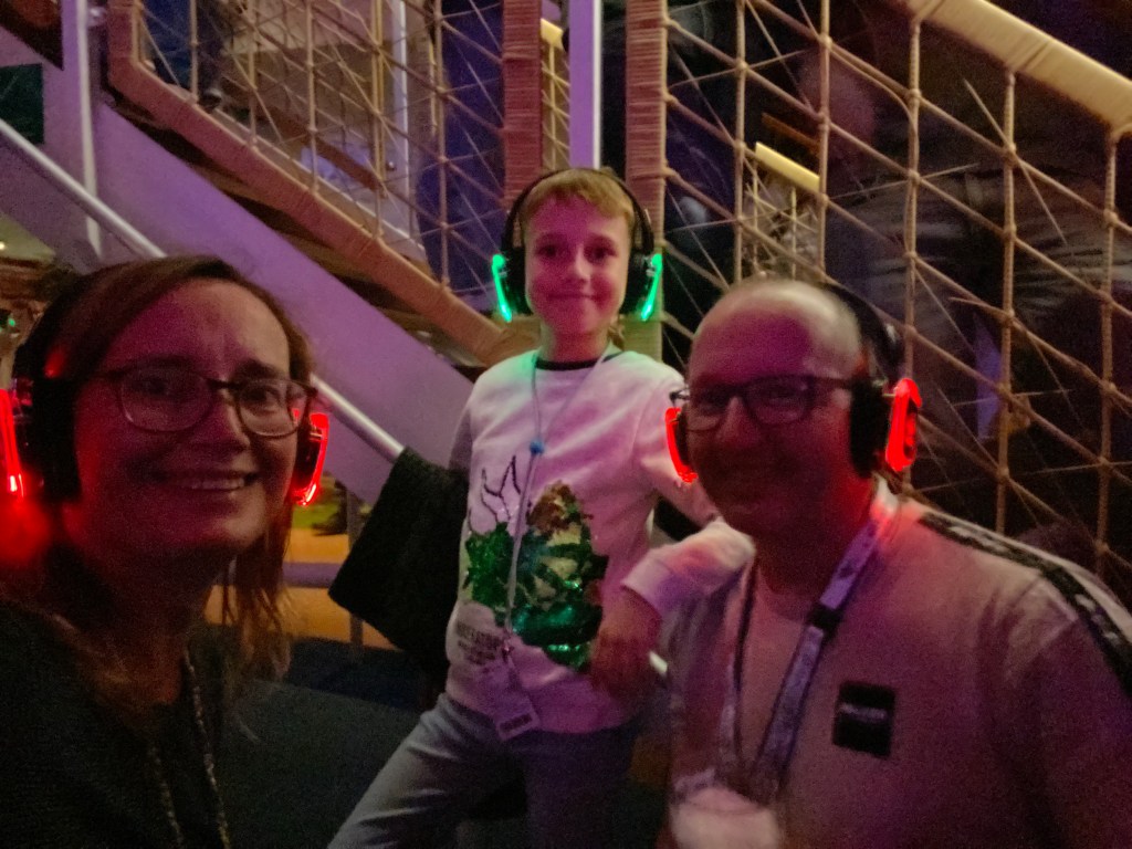 Und wenn man sich so den Bauch mit Kuchen und Torte vollgeschlagen hat, muss man anschließend ordentlich eskalieren. Und das taten wir auch auf unserer ersten Silent Party. Was für eine geile Scheiße war das denn? Alle bekamen Kopfhörer auf und konnten auf drei Kanälen zwischen drei verschiedenen DJ’s wählen, die parallel auf der Bühne auflegten. Es gab Schlager, aktuelle Hits und Dance und man hatte die freie Wahl. So hatte jeder die Mucke, die er haben wollte und tanzte dazu, wie er tanzen wollte. Und alle sangen laut mit, denn bei Kopfhörern ist es ja das Schöne, dass man sich selbst nicht hören kann. Und so wurde die Party innerhalb von Minuten zu einem gigantischen Event mit Spaßfaktor. Denn wirklich alle eskalierten und wir natürlich auch. Die Schlagerfraktion, und ich oute mich mal als Ballermannhits-Mitsinger, machte hierbei am lautesten. Da würde selbst der Ballermann neidisch werden. Schön auch zwischen den lauten Mitsingern, die leicht schaukelnden Dance-Hörer. Die sangen weniger mit, machten aber ein choreografisch wunderschönes Kontrastprogramm.