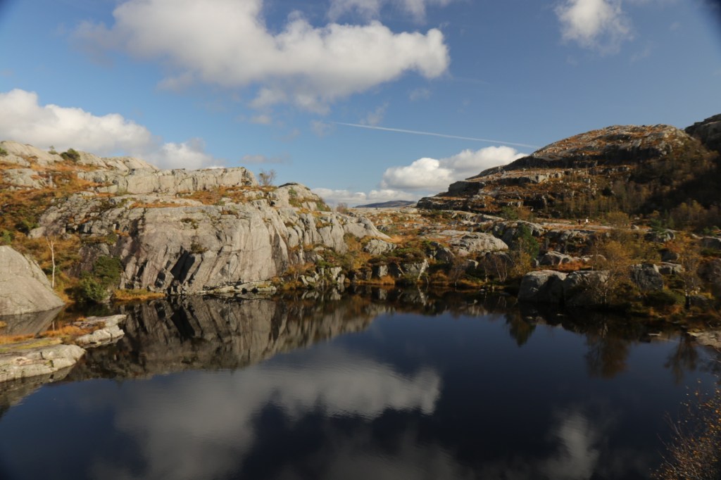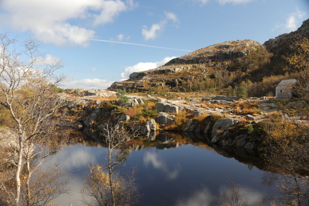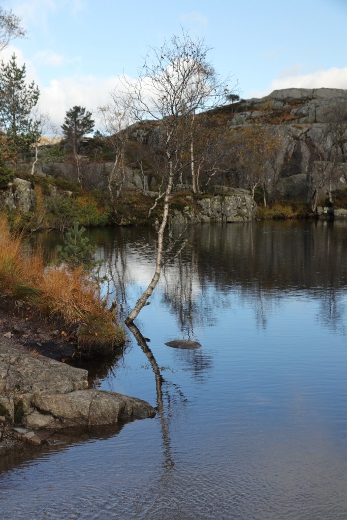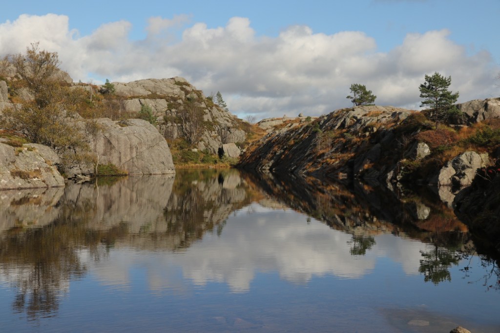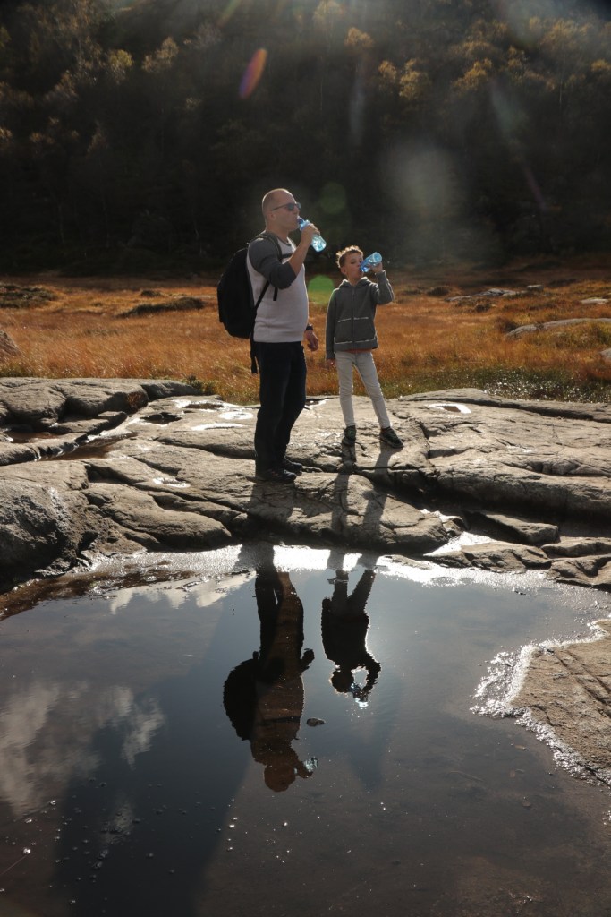 Wir jedenfalls kämpften, schnauften und jammerten, während wir gleichzeitig diesen wunderschönen Tag und das traumhafte Wetter genossen. Ich hatte immer den Fotoapparat im Anschlag, denn dank Wetter sah jede auch noch so kleine Pfütze, wie ein traumhaftes Spiegelbild der Landschaft aus. Auf dem Hinweg bekam ich allerdings nach Hundert Auslösungen das Fotoverbot verhängt, da mein Mann noch Illusionen hatte, das wir dann allein auf der Kanzel des Preikestolen stehen und es sich lohnen würde. Er sah sich schon wie Tom Cruise einen Stunt machen, während ich das Ganze filme, oder anders herum.
