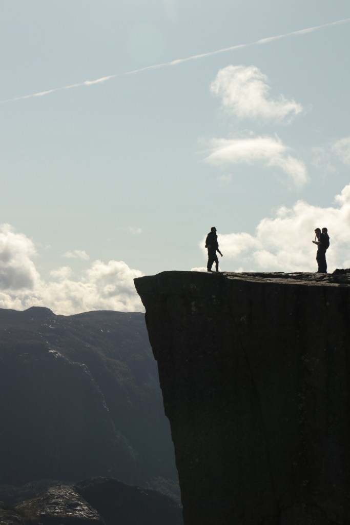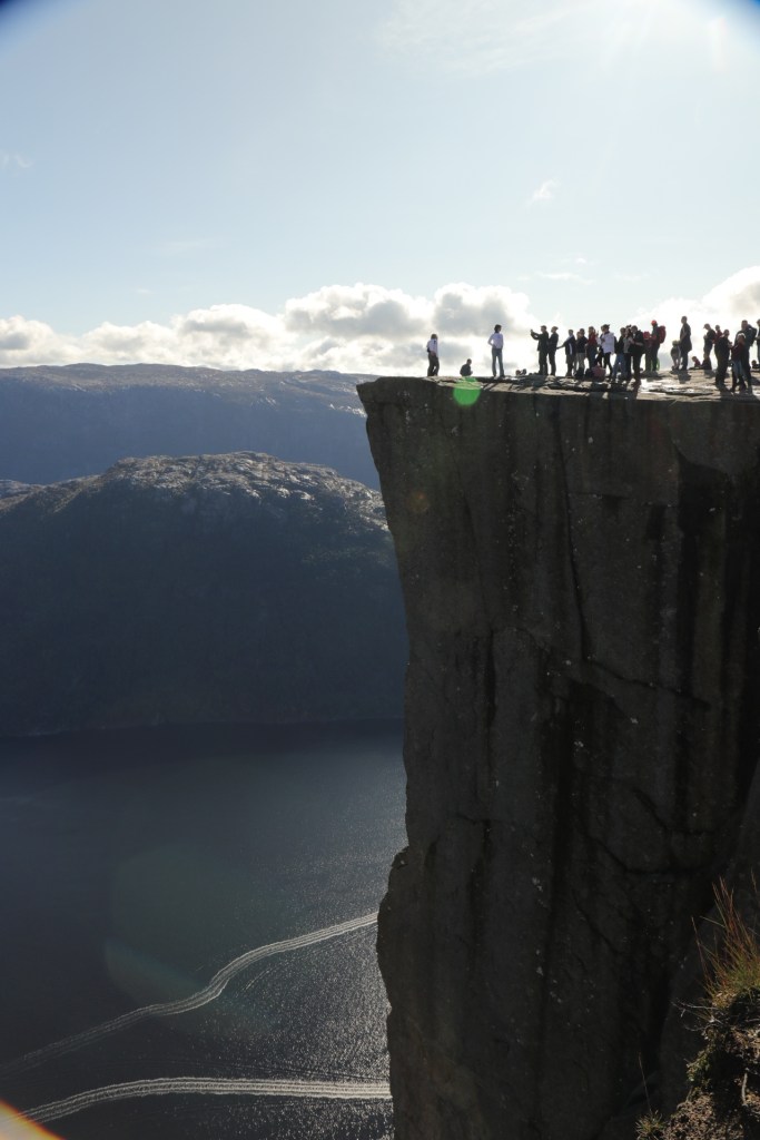 Nach dem ersten ruckeligen Kennenlernen unseres Gefährts waren wir ca. 40 Minuten später und somit noch vor den Bussen am Parkplatz zum Preikestolen. Und dann ging es los auf die Wanderung, die heute Ziel für einige Tausend Menschen war. Ich brauche nicht das Ding mit den Ameisen zu wiederholen, denn auch hier bildete sich schnell eine schnaufende Kette Richtung Berggipfel. Das Ganze wurde noch erschwert durch die Tatsache, dass es meist in Stufen bergauf ging und diese Stufen die Höhe eine normalen Kleinkindes hatten. Als ob Treppensteigen auf der Aida nicht reichen würde, machten wir so unser persönliches Bauch-Beine-Po-Training am Berg. Wenn nun noch vor Einem, ein normales Kleinkind diese Kleinkind-hohen Stufen erklimmen wollte, kam alles in der Schlange zum Erliegen. Ich kann ja verstehen, dass Kinder mit ihrem dicken Kopf so etwas schaffen wollen und befürworte auch diese Willensstärke, aber als 1.000ste in der Reihe fühlt es sich trotzdem doof an. Das einzig Gute an diesen Stopps waren die Pausen, die meine Lunge und meine Beine bekamen. Es ist definitiv kein Spaziergang da hoch, falls es irgendeinem in einem Hochglanzprospekt so verkauft wurde. Es ist eine knapp 9km lange, anstrengende Wanderung, die Trittsicherheit und einiges an Kondition verlangt. Also immer schön überlegen, ob man drei Kleinkinder plus Hund und Verpflegung für 20 Tage mitnehmen sollte. Nur so als Idee.