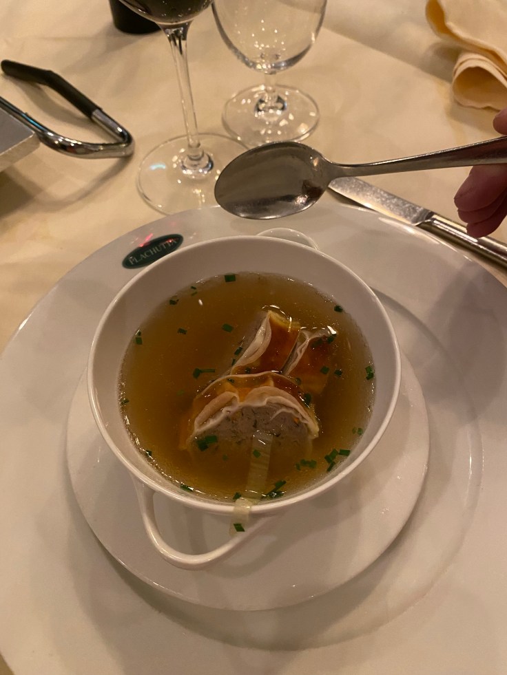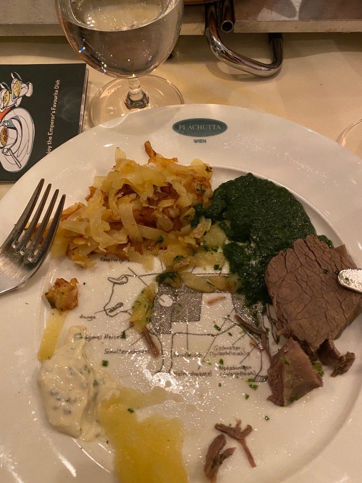 Wir stattdessen hatten im „Plachutta“ einen Tisch reserviert und befanden uns somit in der nächsten Gelddruckmaschine der Stadt. Zwar existiert es noch nicht seit Jahrhunderten, aber es ist nahezu genauso bekannt unter Wien-Liebhabern. Und zu diesen zählen wir ja schließlich, also sind wir auch hier mittlerweile schon fast auf dem Status eines Stammgastes. Vielleicht laufen wir inoffiziell noch unter Wiederholungstätern, aber wir fühlen uns heimisch. Und das nur, weil es nirgends so leckeren Tafelspitz gibt wie hier. Von der Brühe, über die Stulle mit dem Mark aus dem Knochen, bis hin zum Tafelspitz selbst, inklusive der Beilegen eine wahre Köstlichkeit. Nur scheinen die Österreicher definitiv andere Aufnahmekapazitäten im Bauch zu haben. Deshalb mein Tipp: Eine Portion zu zweit essen und man geht sehr zufrieden wieder raus.