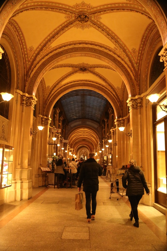 Nächster Versuch der alkoholischen Getränkeaufnahme war die Ferstel Passage mit zahlreichen Freisitzen und Lokalitäten. Und dort fanden wir auch die zweite Austern- und Champagnerbar des Tages. Gefühlt gibt es hier irgendwie deutlich mehr Champagner als Glühwein, also rein mit dem guten Zeug und somit offiziell in Wien aufgenommen.