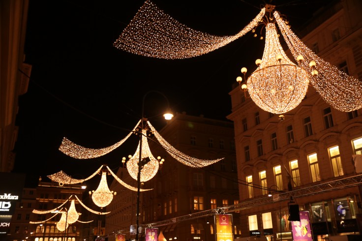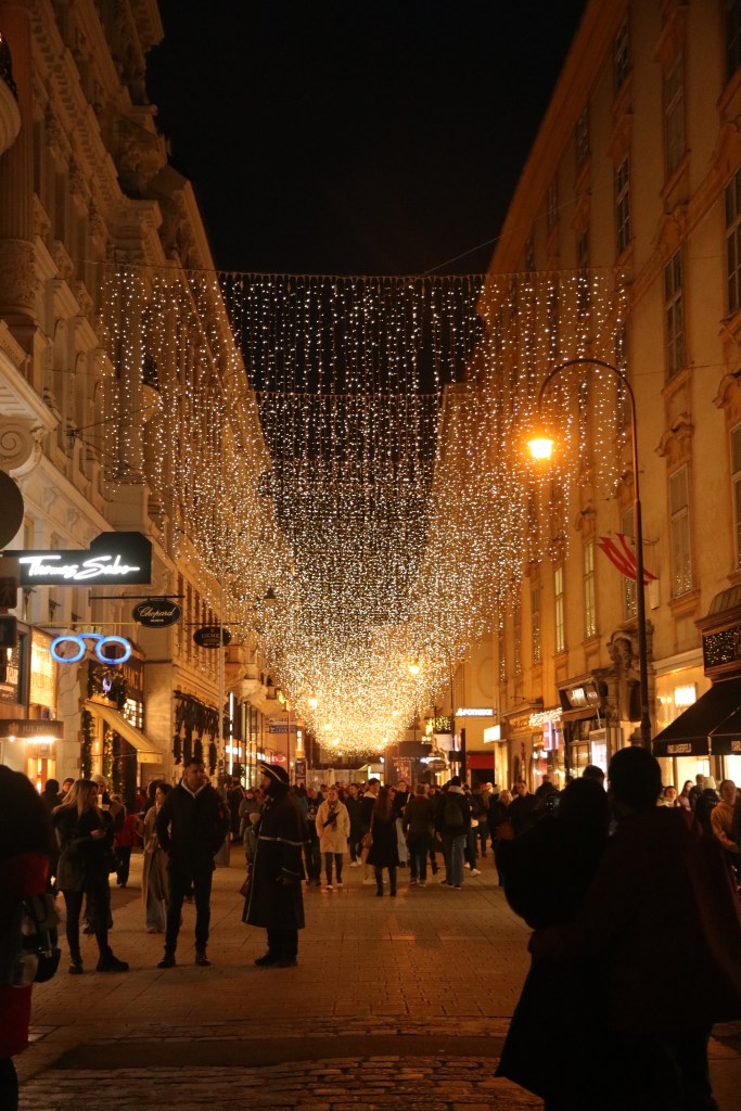 7 Etagen hin oder her, wir waren ja nicht zum Treppen steigen hier, sondern um Wien zu erkunden. Dazu muss man sagen, dass wir Wien-Liebhaber und -Wiederholungstäter sind. Ich bin nun schon zum 6. Mal hier und kann nicht genug bekommen von dieser Stadt. Doch es ist unser allererstes Silvester hier und das muss gefeiert werden. Also schnell mit der U-Bahn innerhalb von nur 15 Minuten in die Innenstadt und rein in den Trubel. Den Hinweis am Ortseingangsschild hätten sie sich spätestens hier sparen können, denn die gesamte Innenstadt war voller Touristen. Alle im Kaufrausch oder mit Glühwein oder Schampus in der Hand. Denn dass wirklich schöne an dieser Stadt ist die Weihnachtsbeleuchtung und die Tatsache, dass hier einige der Weihnachtsmärkte bis ins Neue Jahr geöffnet haben. Neben der Tatsache, dass hier genauso oft Champagner ausgeschenkt wird, wie Glühwein bei uns zu Hause.