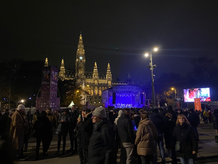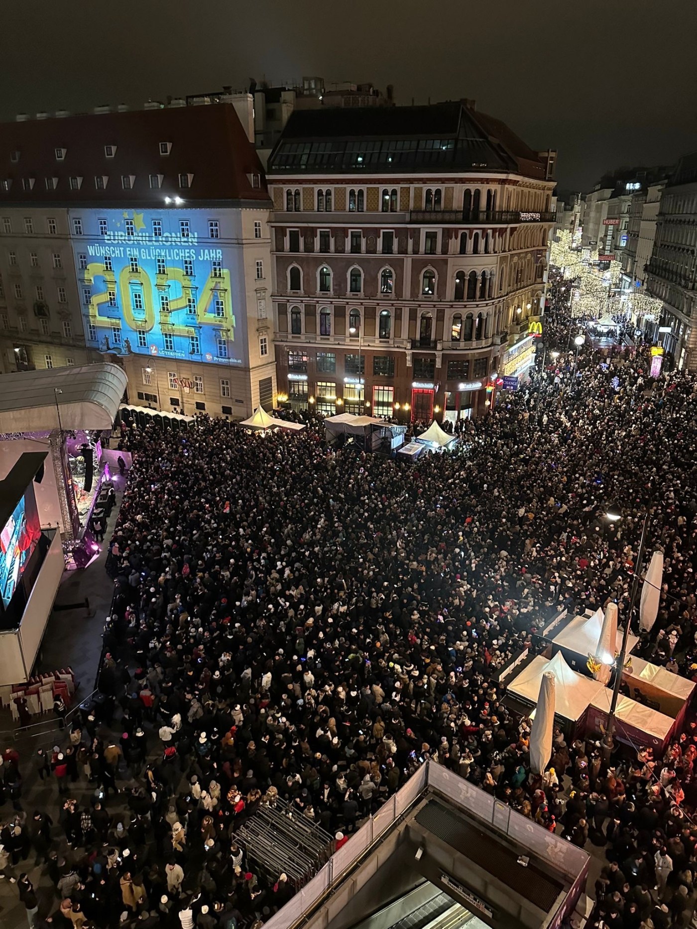 Als dann an dem Rathausturm die Uhr von 59 Sekunden an herunterzählte, zählten in Wien über 800.000 Menschen mit und besonders der Countdown wurde lautstark zelebriert. Und dann war es soweit: Das Jahr 2024 begann und es ertönten auf allen Bühnen zeitgleich die Klänge zum Donauwalzer. Die Menschen nahmen sich in die Arme und wiegten sich zu den Melodien. So auch wir. Da es dunkel und verdammt eng war, sah dann auch keiner, wie schlecht wir tanzten. Und es war auch völlig egal, ob wir hier Profi’s sind oder halt eben nicht. Es spielte einfach keine Rolle.