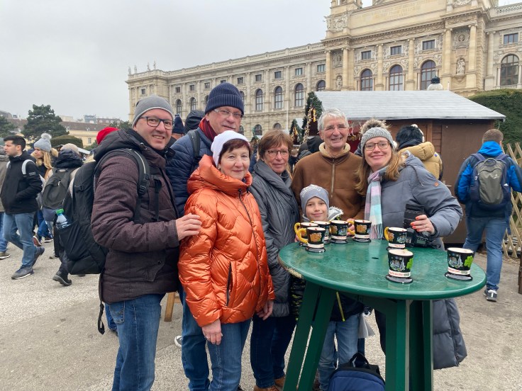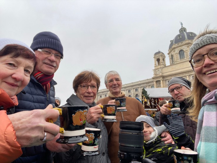 Natürlich entführen wir unsere „Touristen“ auf einen der Weihnachtsmärkte und natürlich gibt es einen Glühwein zum Anstoßen auf die gelungene Überraschung. Das darf schließlich nicht fehlen. Eigentlich wollte mein Onkel mit uns einen schönen Wiener Melange in einem der Café-Häuser trinken. Aber die Schlangen dort waren heute an Silvester eher noch länger. Und ein Glühwein ist sowieso viel leckerer.